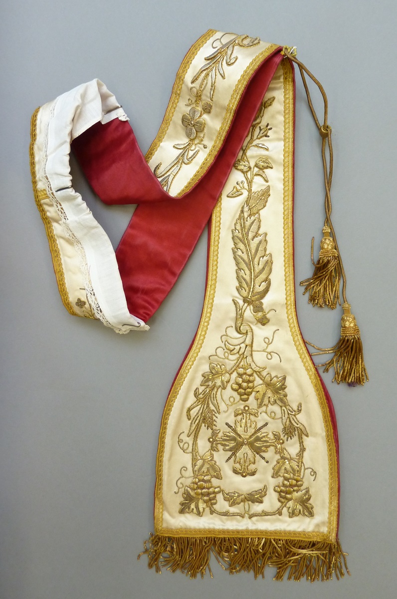 Witte stola met gehoogd goudborduurwerk van rozen- en druivenranken