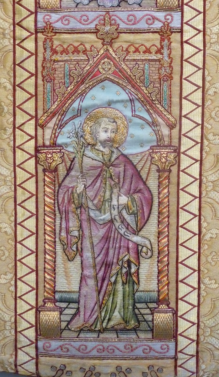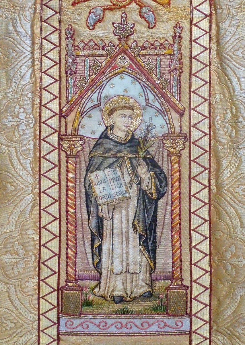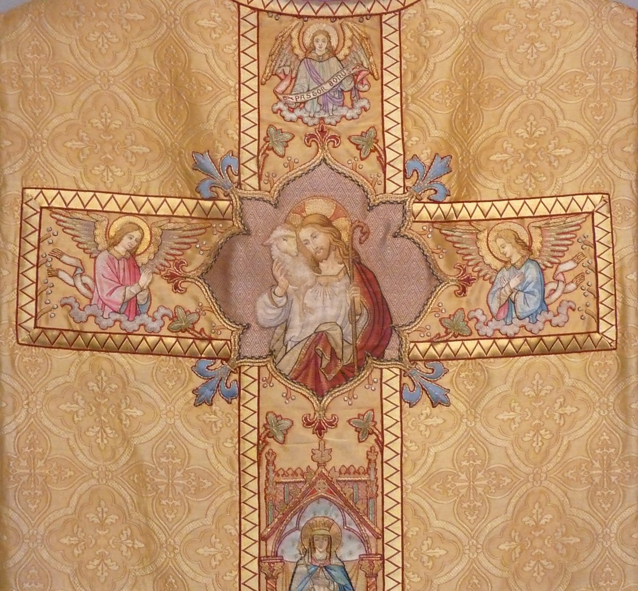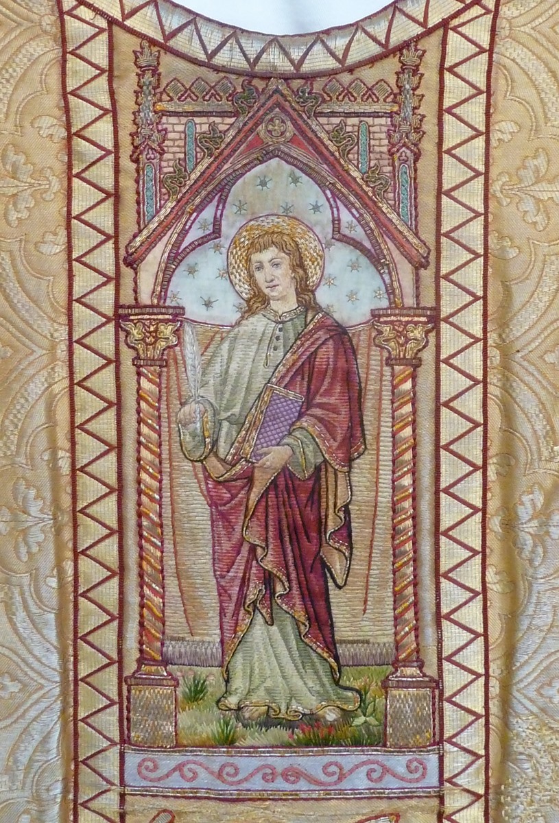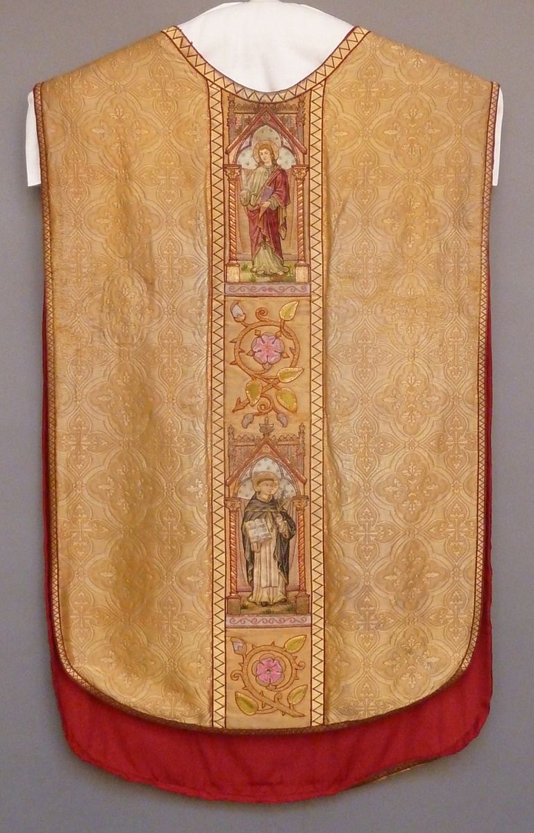 Goudkleurig kazuifel met Johannes Evangelist en dominicaan, op achterzijde de Goede Herder