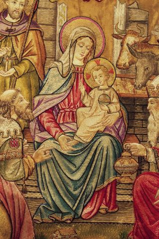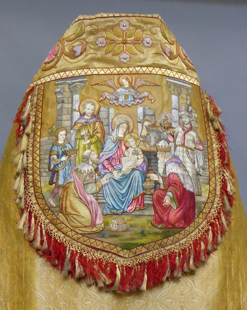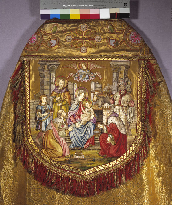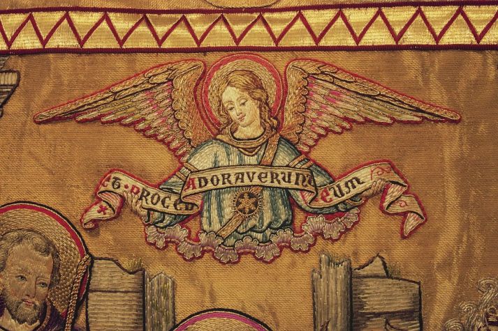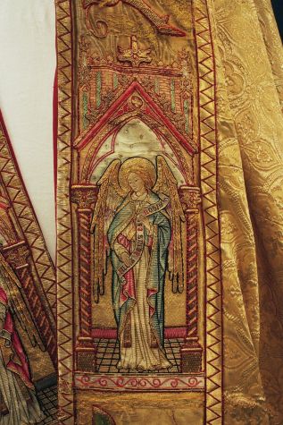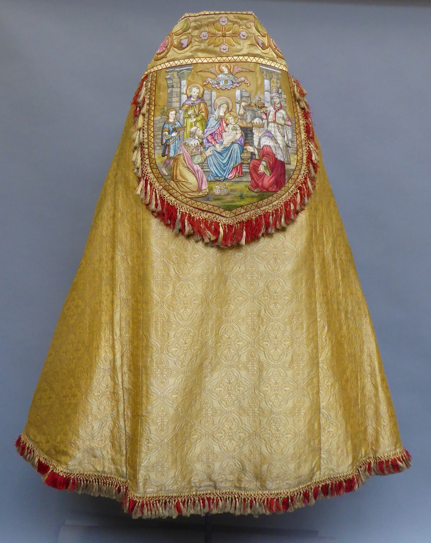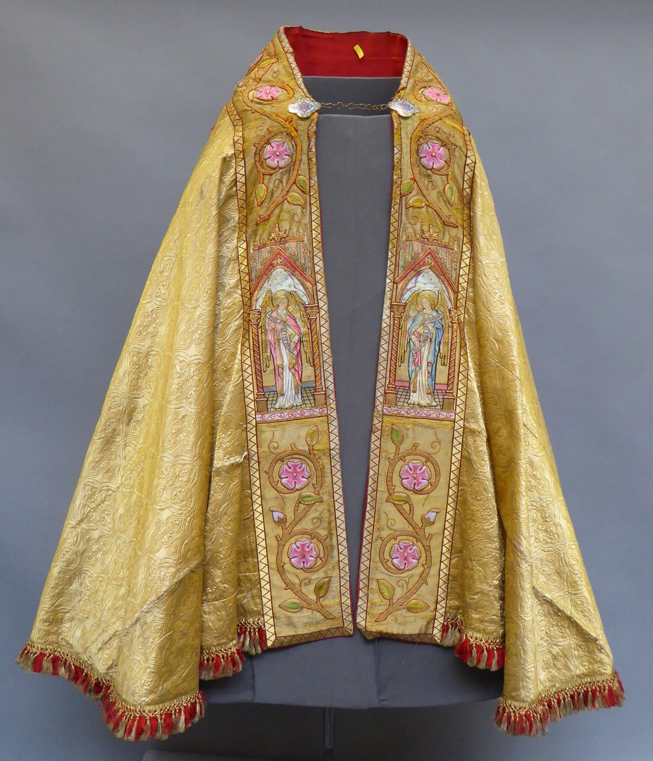 Goudkleurige koorkap met engelen met banderollen, op achterzijde aanbidding, koorkapsluiting van email