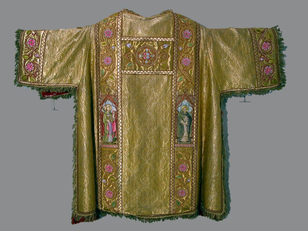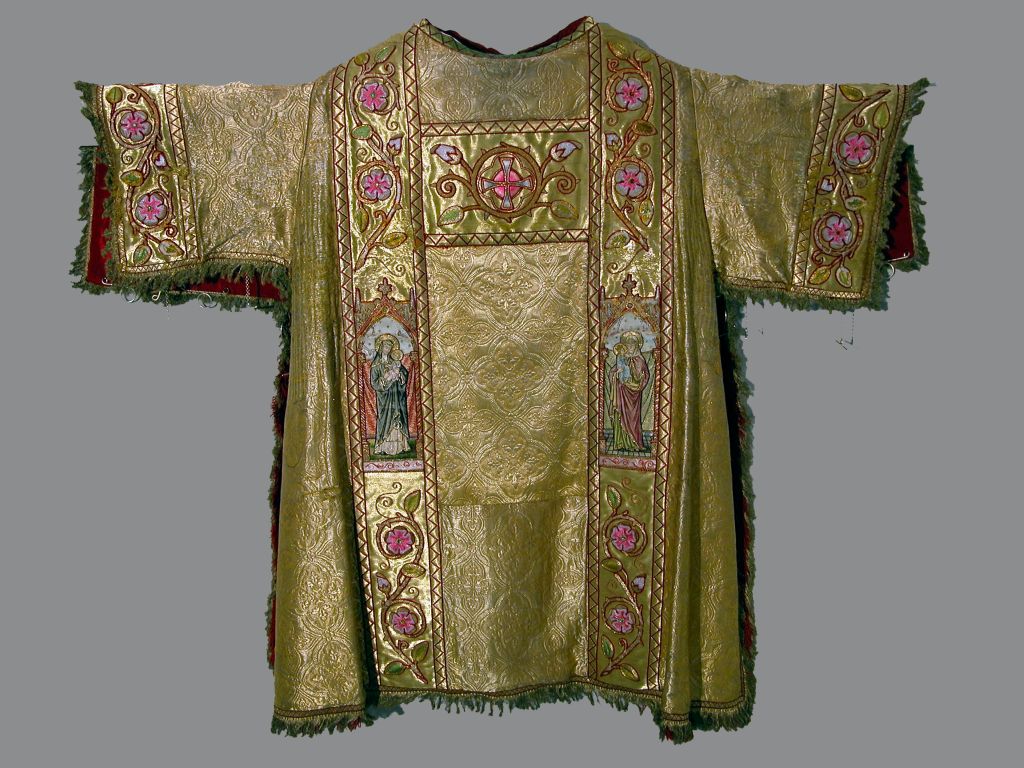 Goudkleurige dalmatiek met Maria met Christuskind en duif, Anna met gekroonde Maria, op achterzijde Augustinus, en martelaar van Gorcum, dominicaan Joannes pastoor van Hornaar(?) met touw om nek