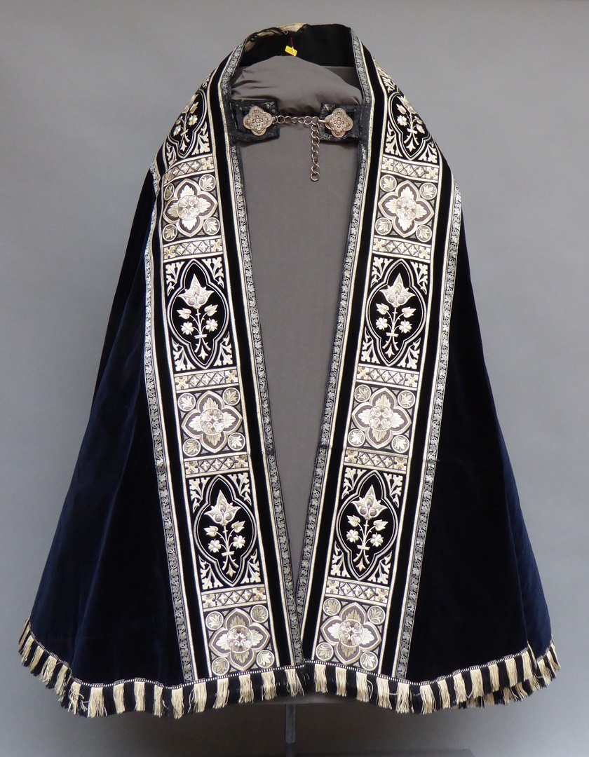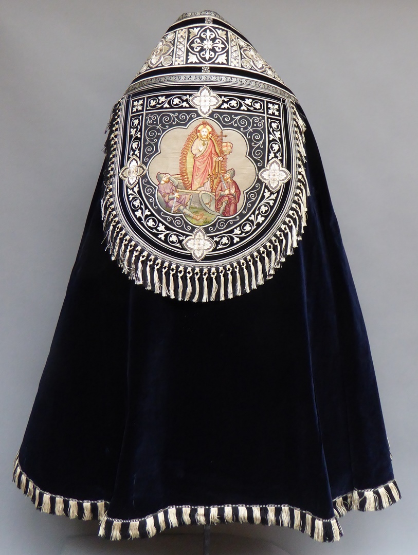 Donkerblauwe koorkap met op schild geborduurde verrijzenis