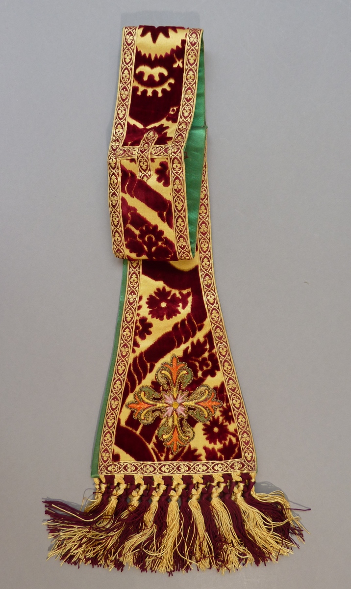 Rode manipel met geschoren granaatappelpatroon, gele achtergrond, geborduurde leliekruisjes