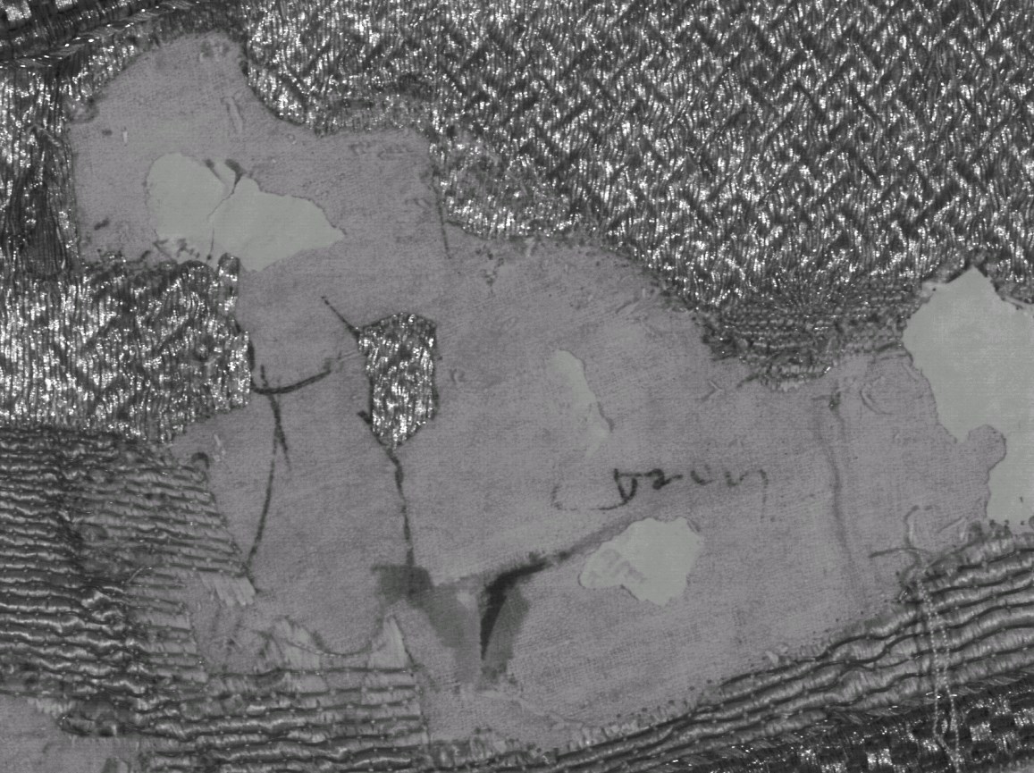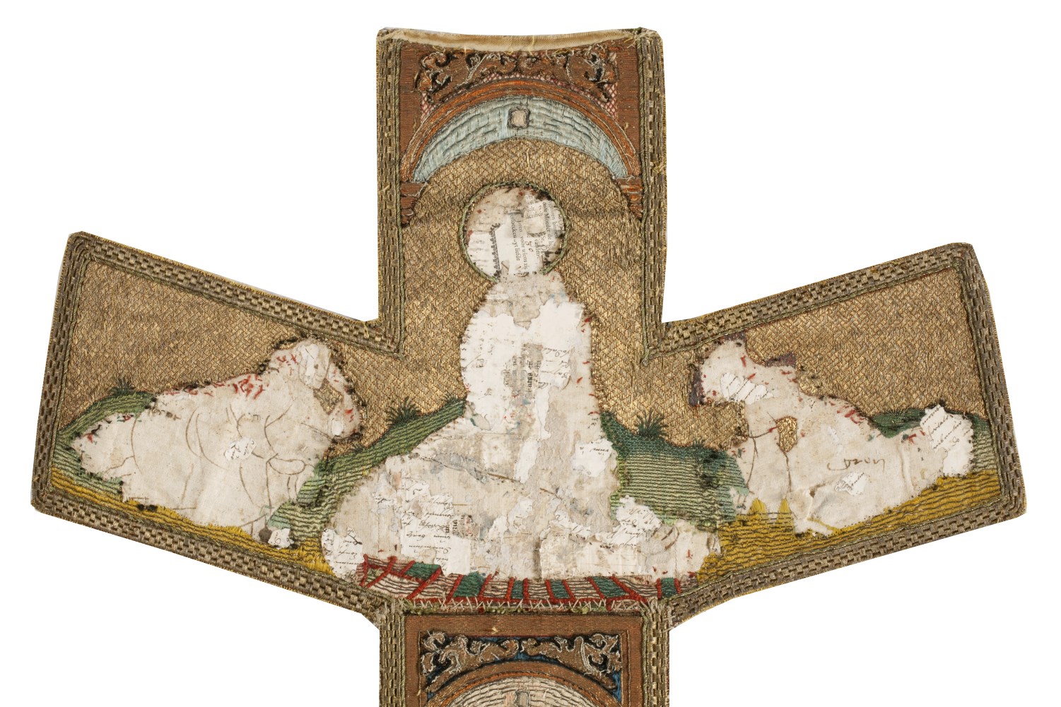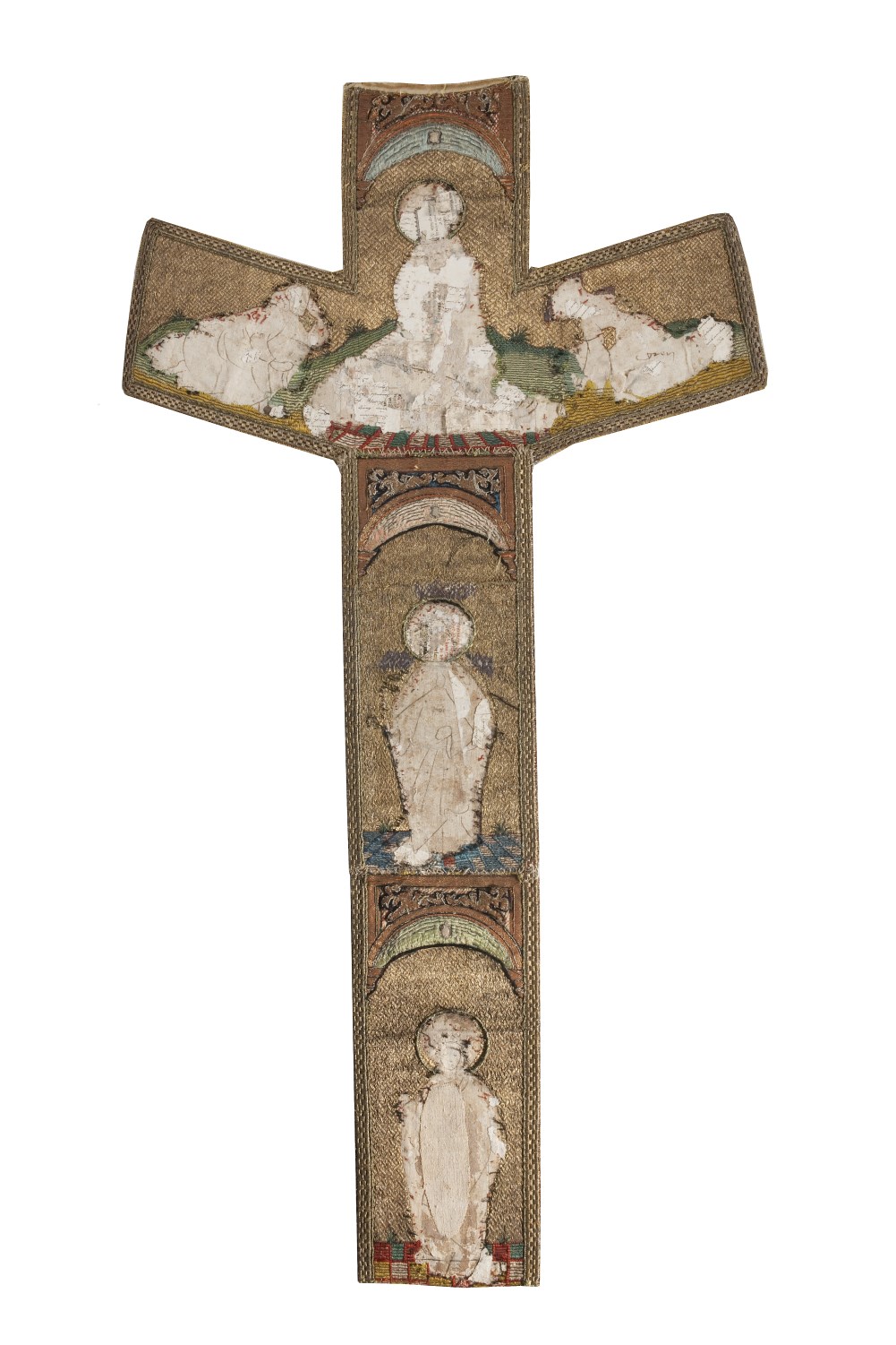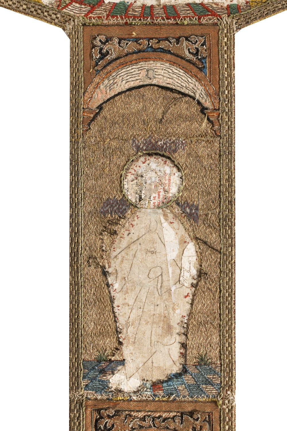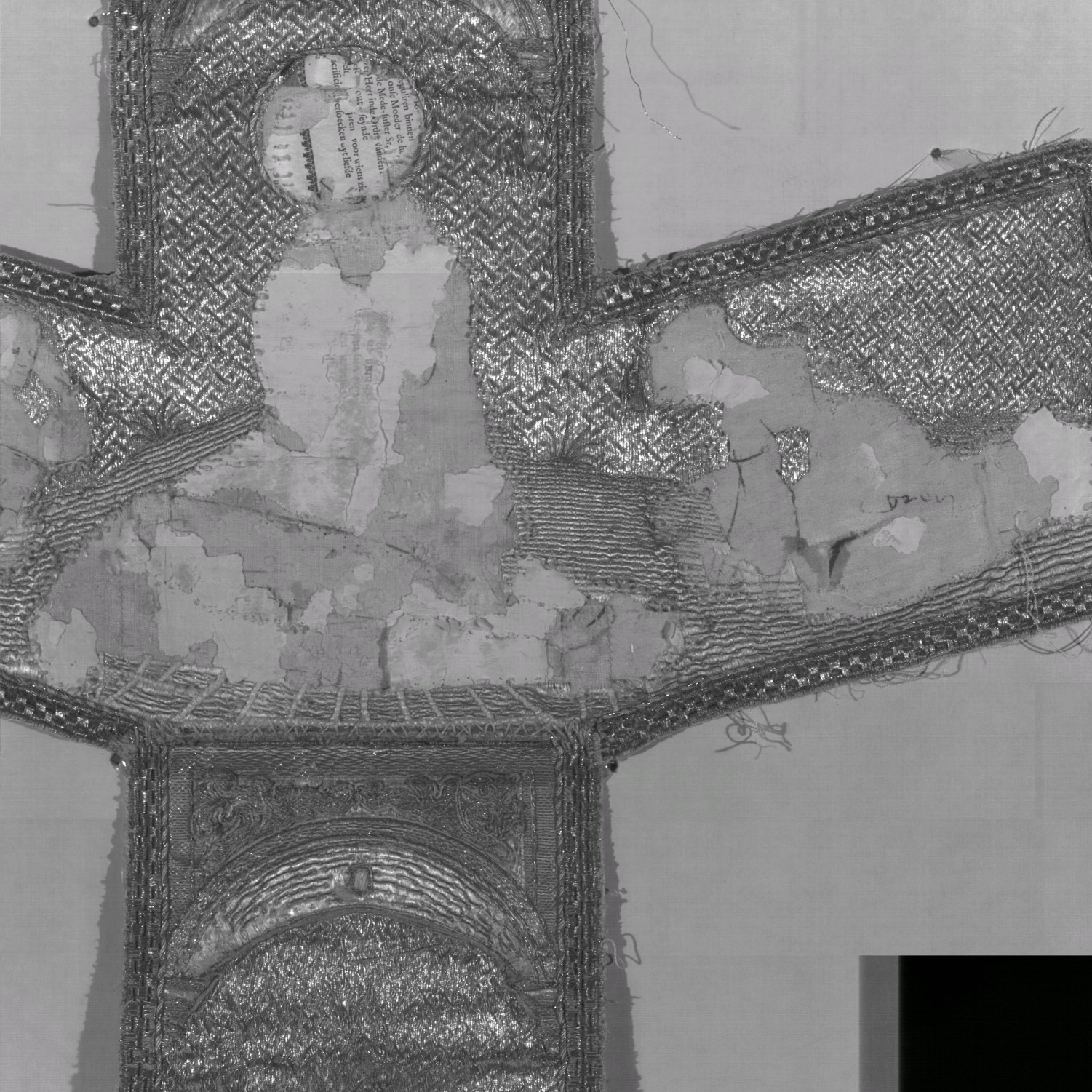 Versiering van een kazuifel in de vorm van een gaffelkruis, waarvan de figuren verdwenen zijn. Op het gaffelkruis bevonden zich oorspronkelijk op de staande balk twee heiligen en op de korte balk en beide zij-armen een zittende figuur (Maria met Kind?) geflankeerd door twee knielende figuren (engelen?). Op de uitgespaarde plaatsen van de figuren zijn ...