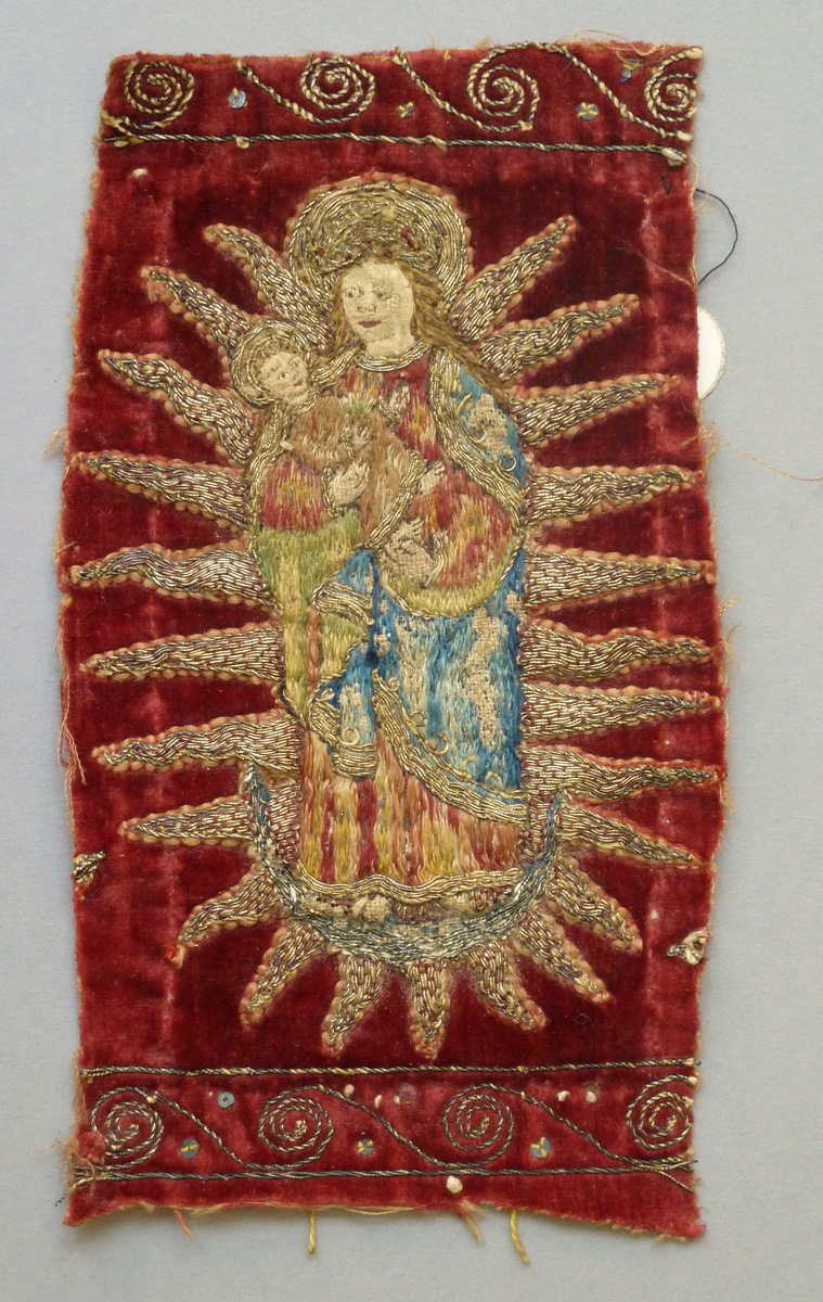 Borduursel met Maria in stralenkrans staand op maansikkel met Christus op rechterarm