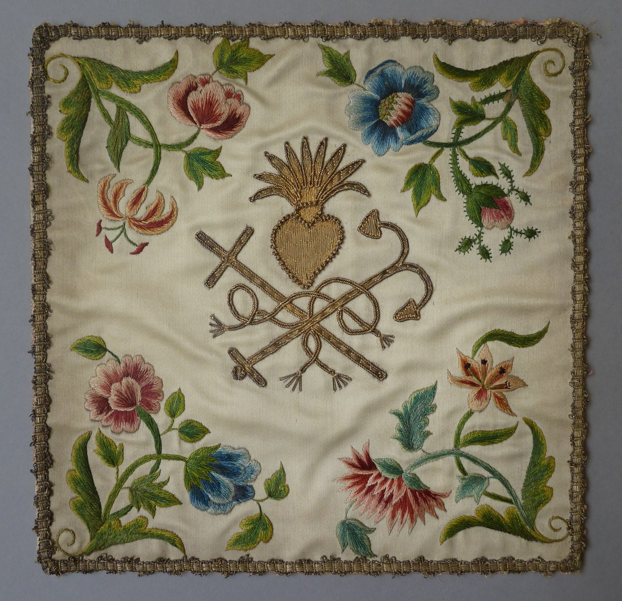 Borduursel van witte palla met bloemen, brandend hart, kruis, anker