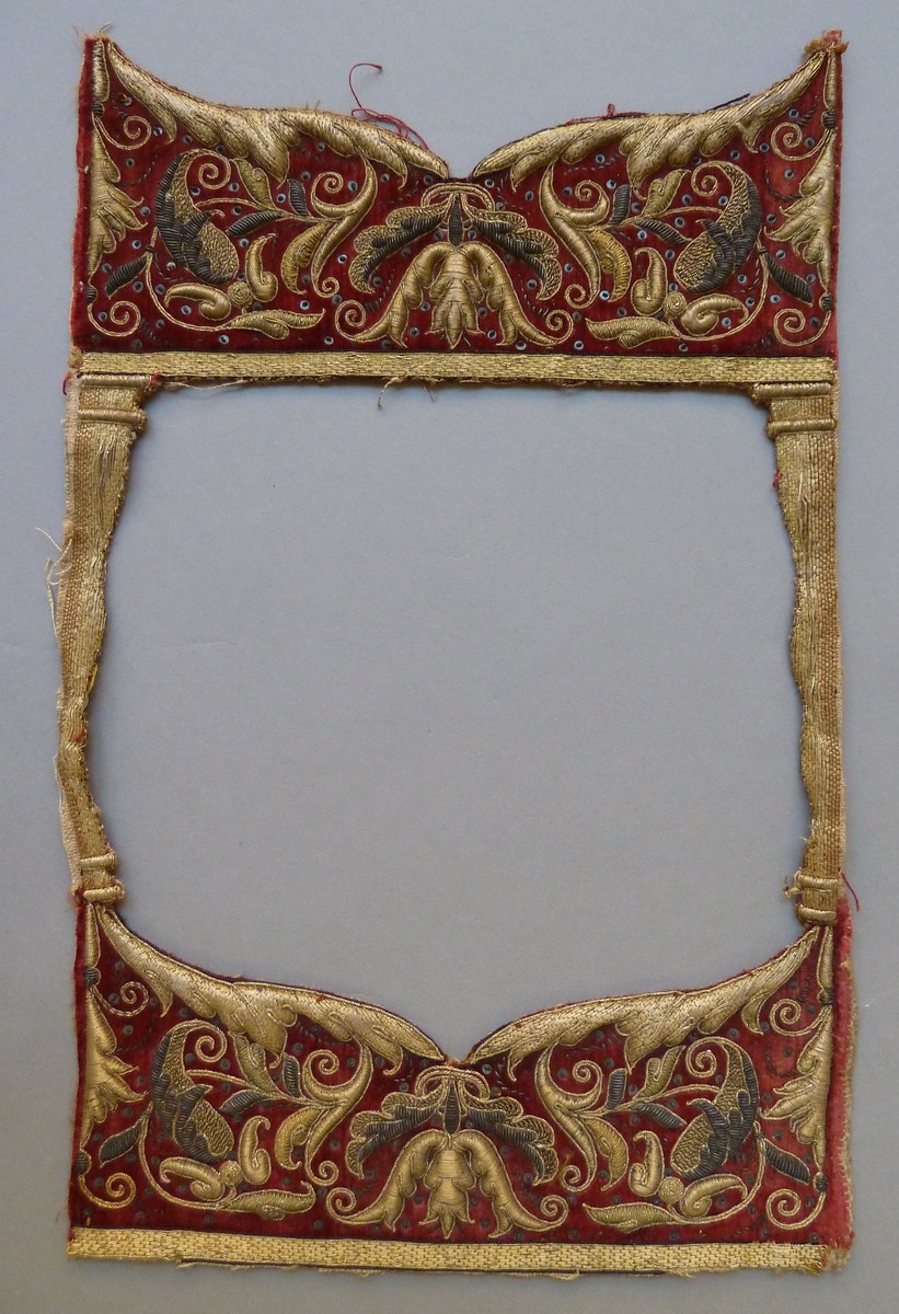 Rood textielfragment bestaande uit twee delen verbonden met stroken, florale motieven