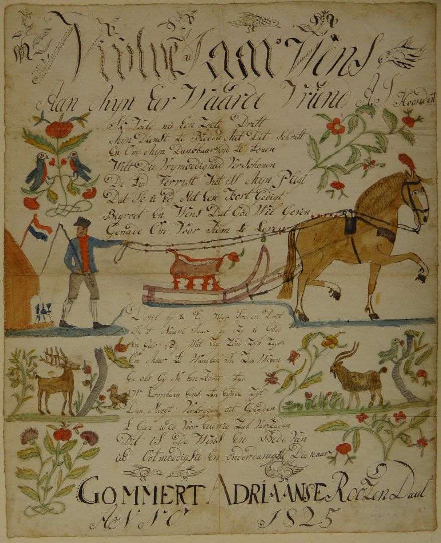 Kalligrafie met nieuwjaarswens, paard, slee en paardenmenner