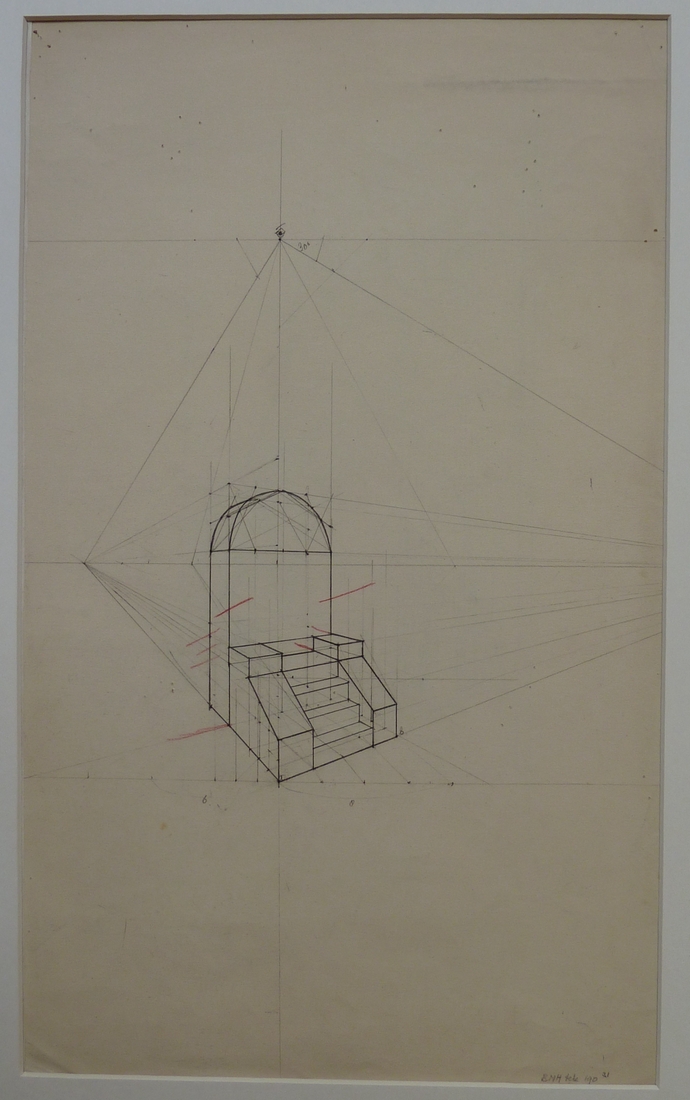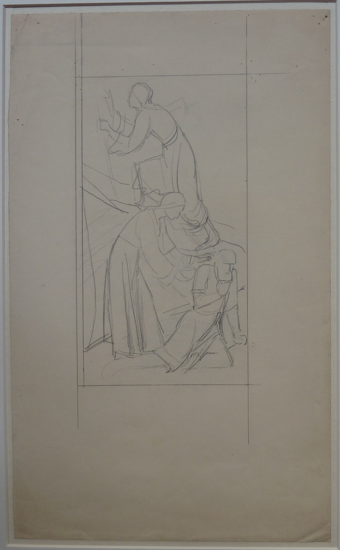 Ontwerp geveldecoratie Rozenkranskerk, schets van drie figuren, op achterzijde ontwerp voor ingang