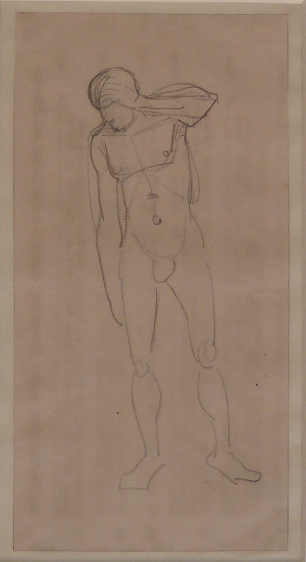 Schets van staande figuur met hand voor ogen