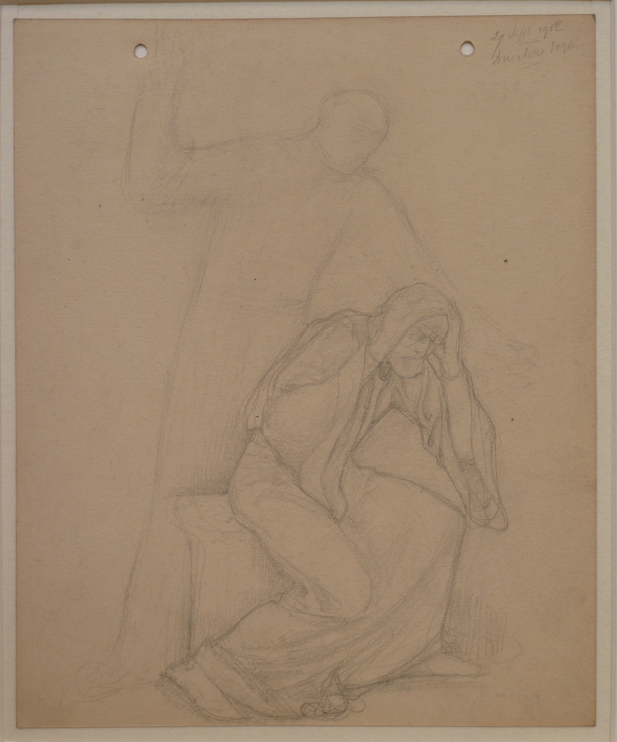 Schets van een staande figuur met geheven hand en een zittende figuur die hoofd beschermt