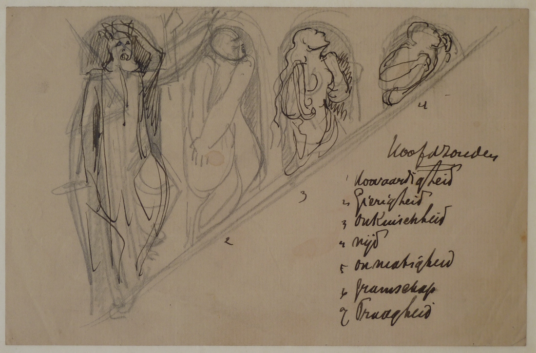 Ontwerp wandschildering "hoofdzonden": hoovaardigheid, gierigheid, onkuischheid, nijd, enz.