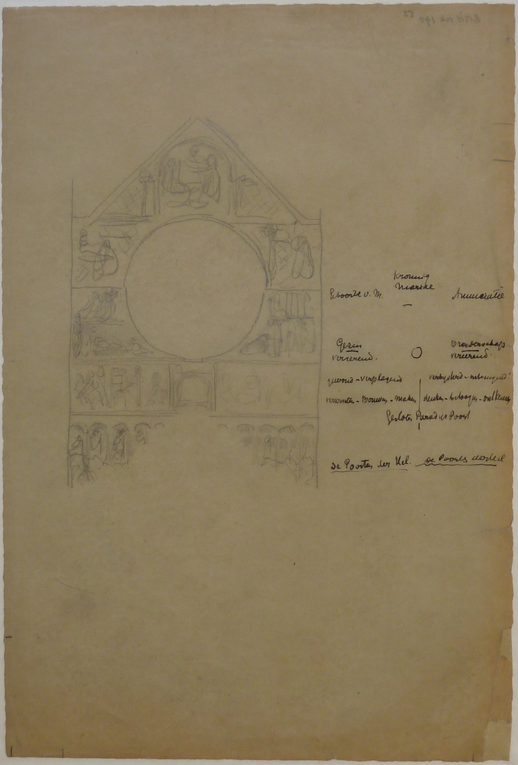 Schets decoratieprogramma Rozenkranskerk te Amsterdam, ernaast tekstaanduiding diverse scènes