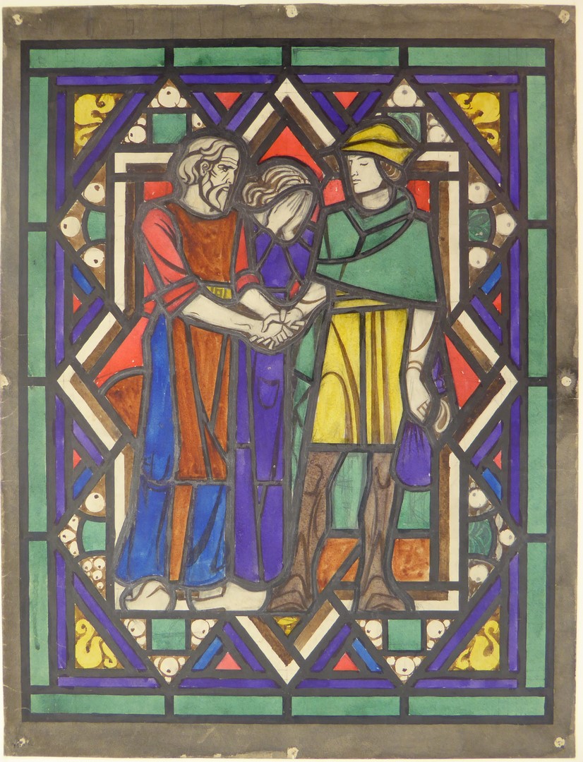 Afscheidsscène(?) met man die jongeman de hand geeft, ertussen een vrouw met handen voor het gezicht