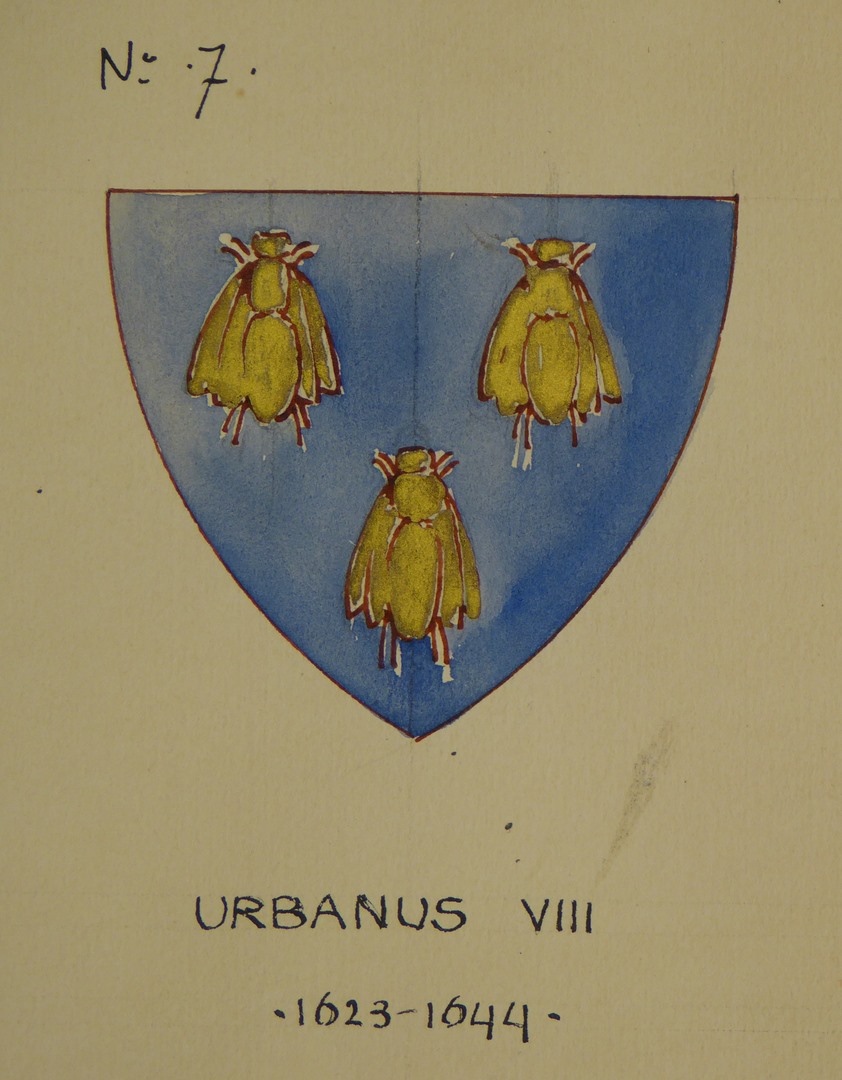 Tekening met blauw schild met drie bijen en "No. 7 Urbanus VIII 1623-1644"