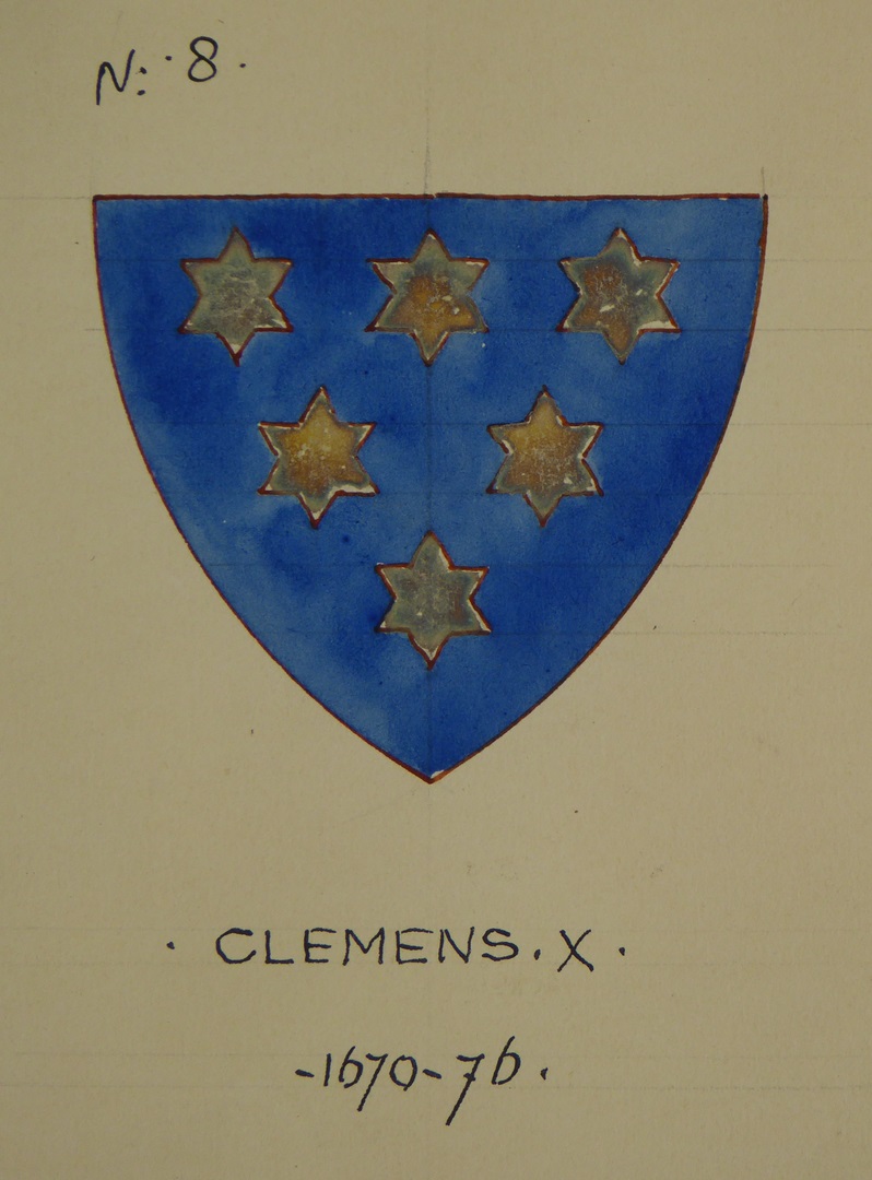 Tekening met blauw schild met zes sterren en "No. 8 Clemens X 1670-76"