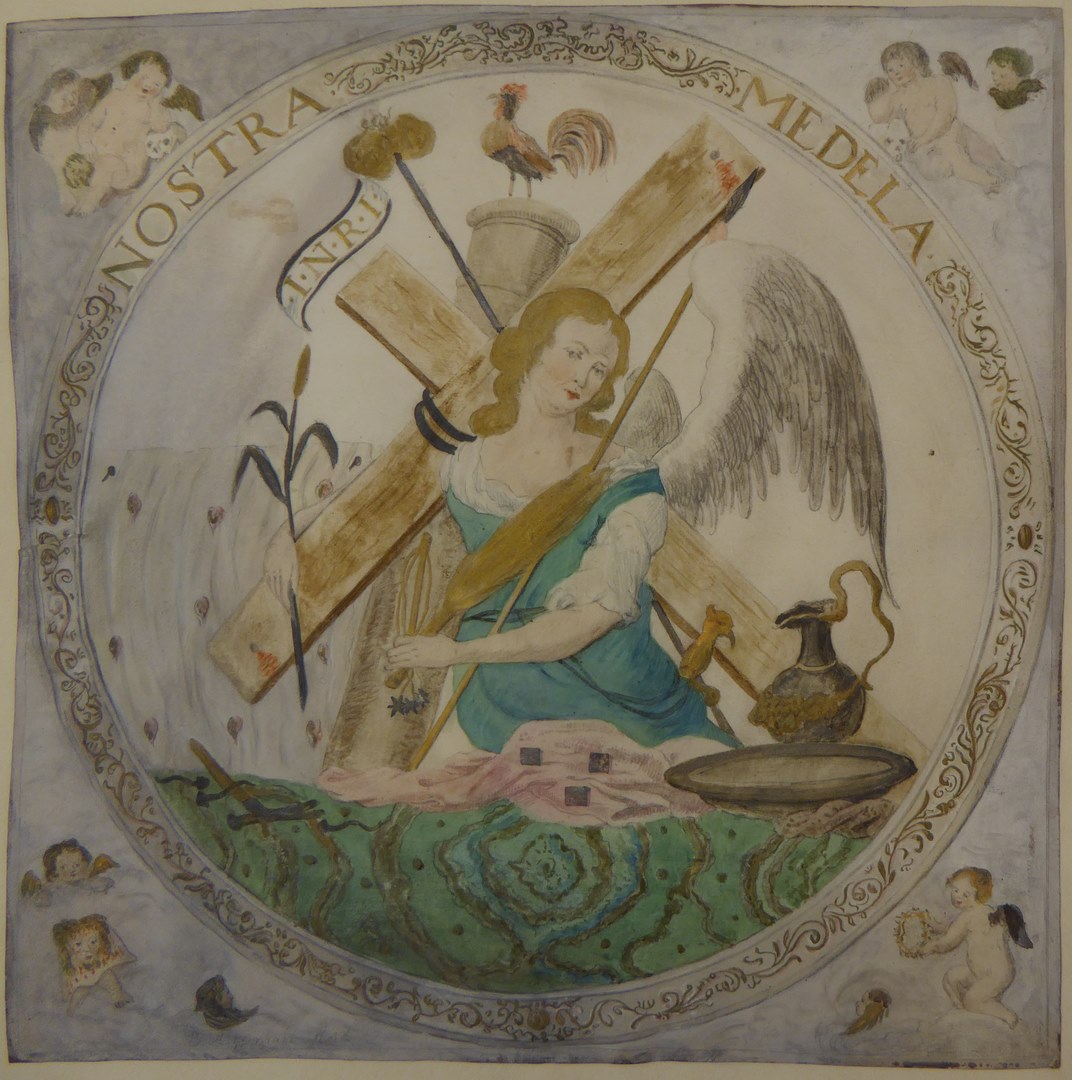 Engel met passiewerktuigen, met "Nostra medela"