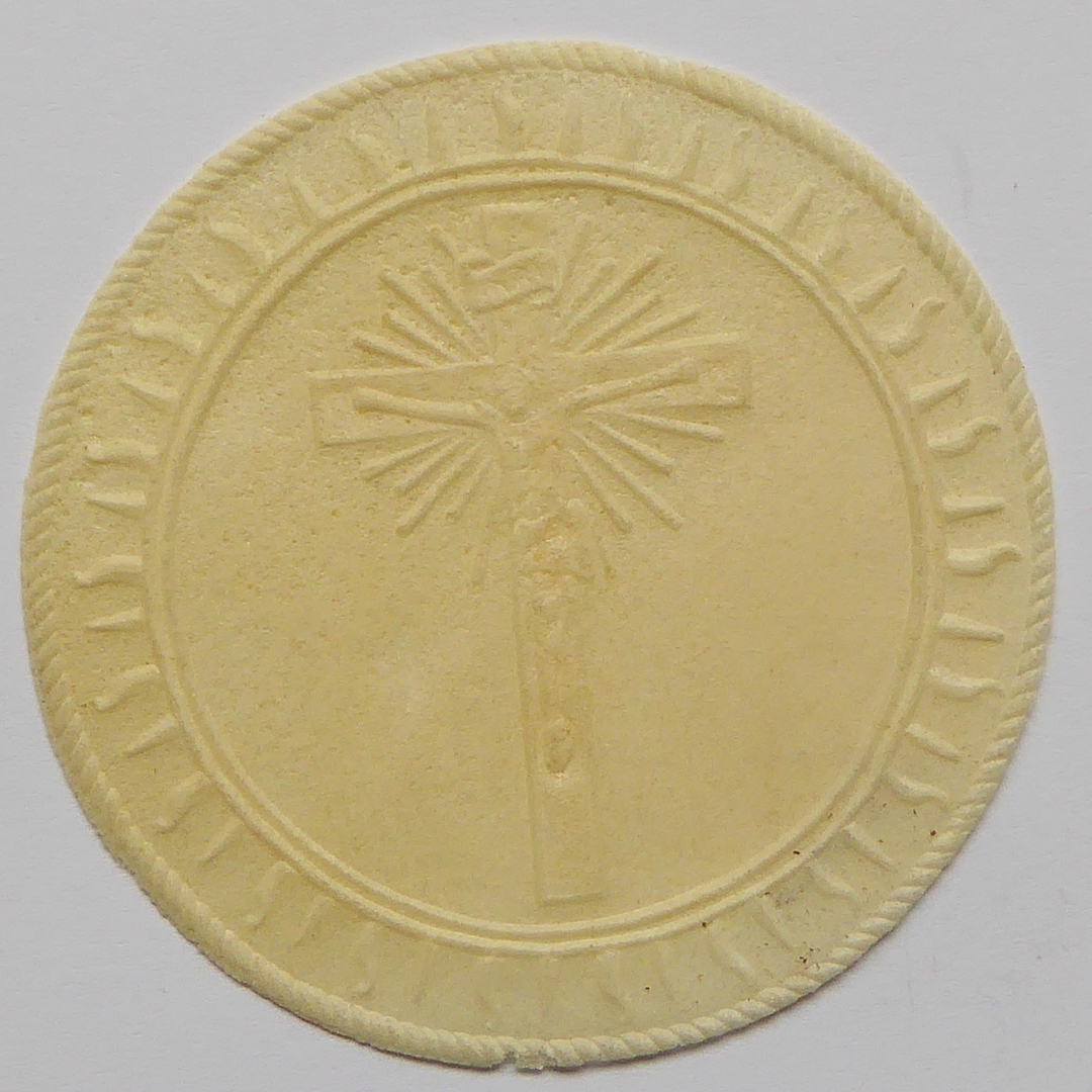 Hostie met gekruisigde Christus met INRI, rand met stralenkrans en vlammetjes