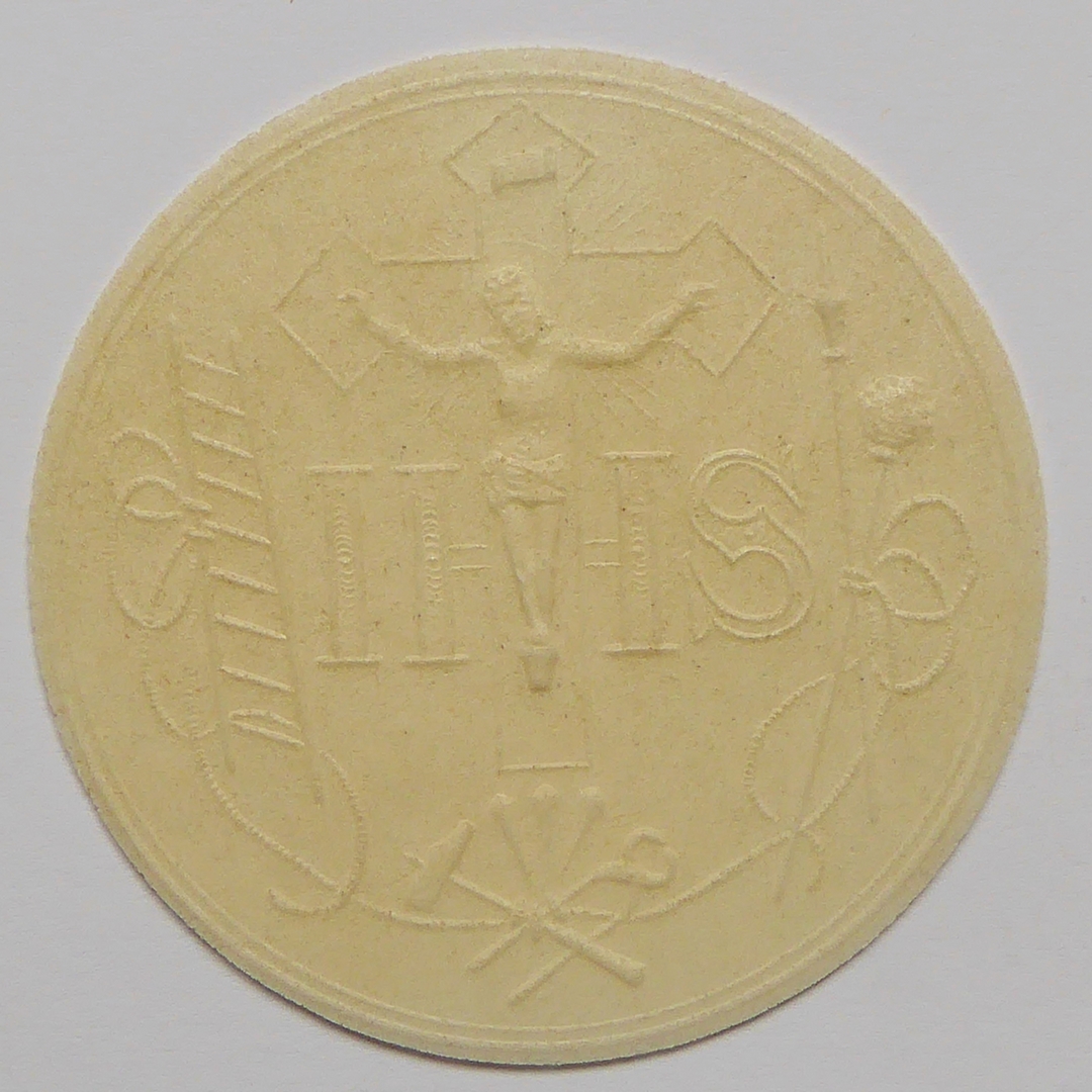 Hostie met gekruisigde Christus met INRI, IHS, ladder, spons en speer, hamer, nijptang en drie nagels