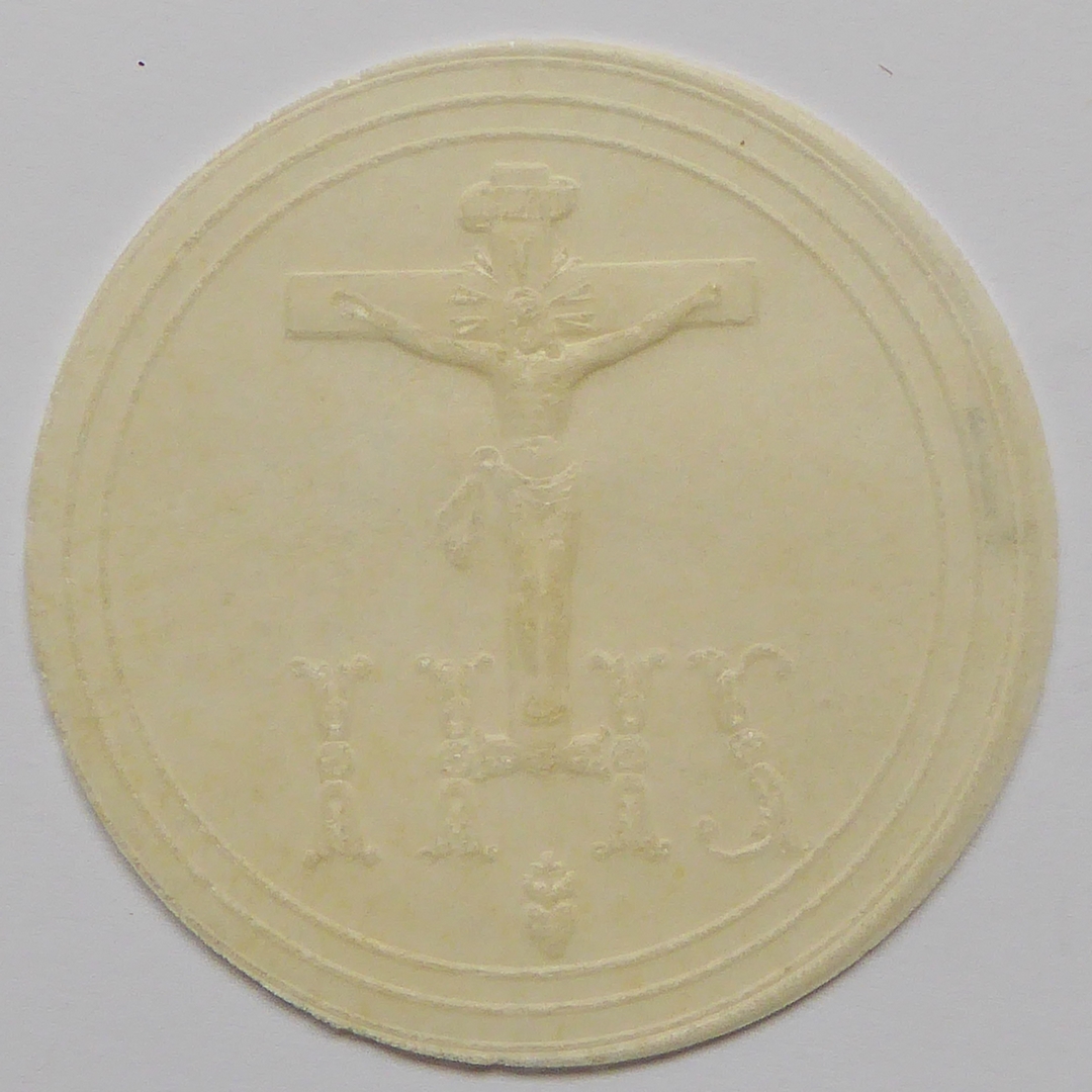Hostie met gekruisigde Christus met INRI, IHS en brandend hart
