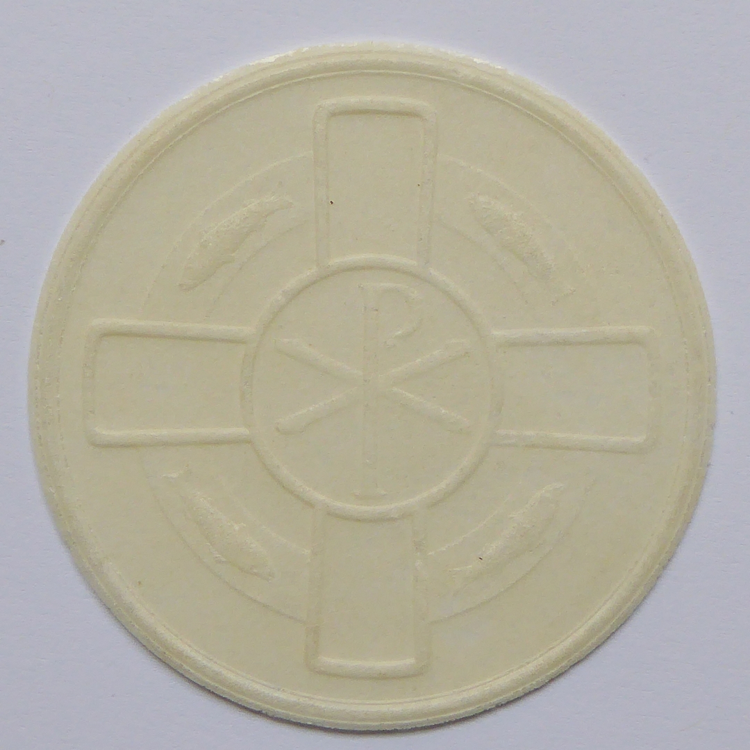 Hostie met Grieks kruis met op de kruising een medaillon met het Christusmonogram, rondom vier vissen