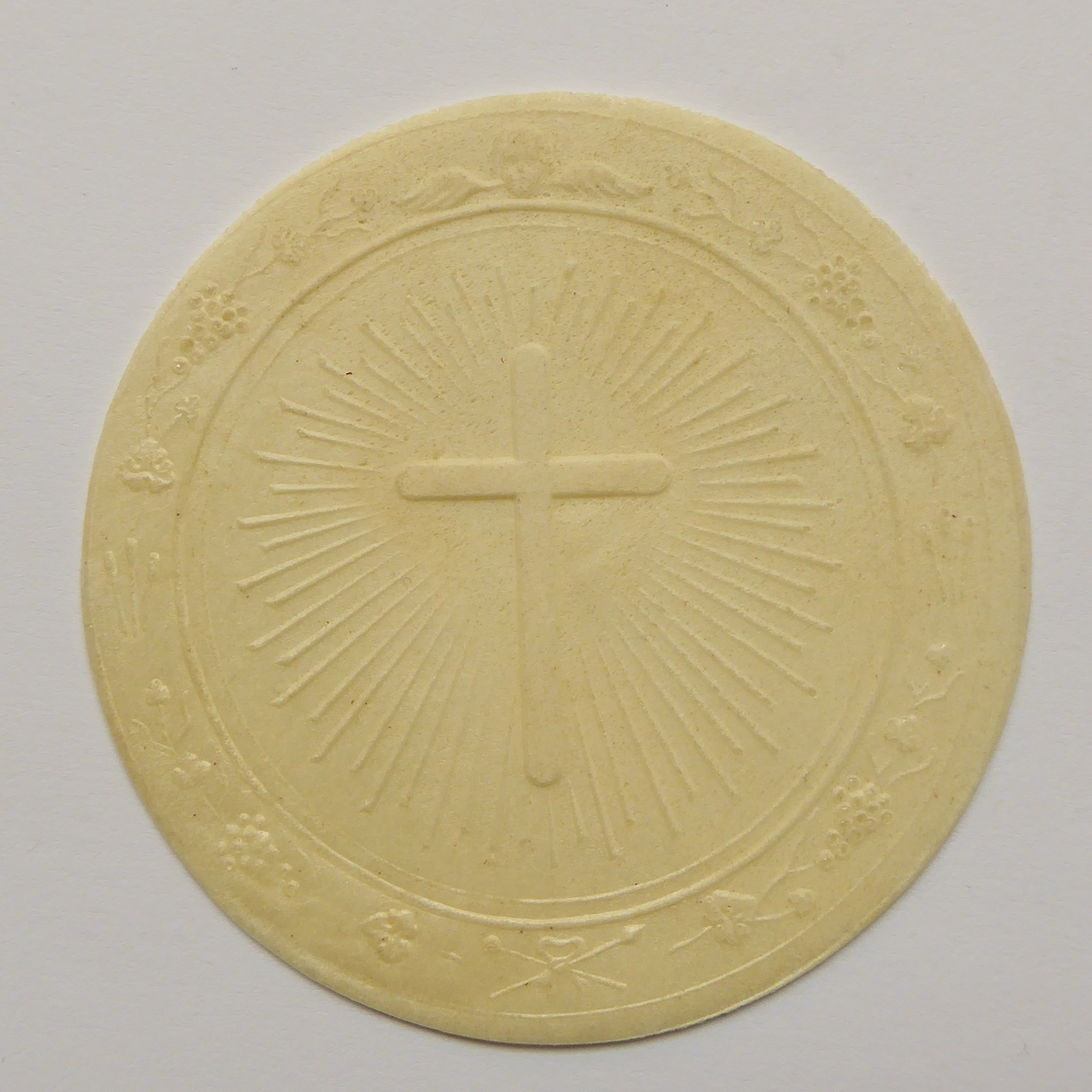 Hostie met gekruisigde Christus met INRI, rand met druivenrankKruis in stralenkrans, rand met cherubijnkopje, druivenranken, speer en spons