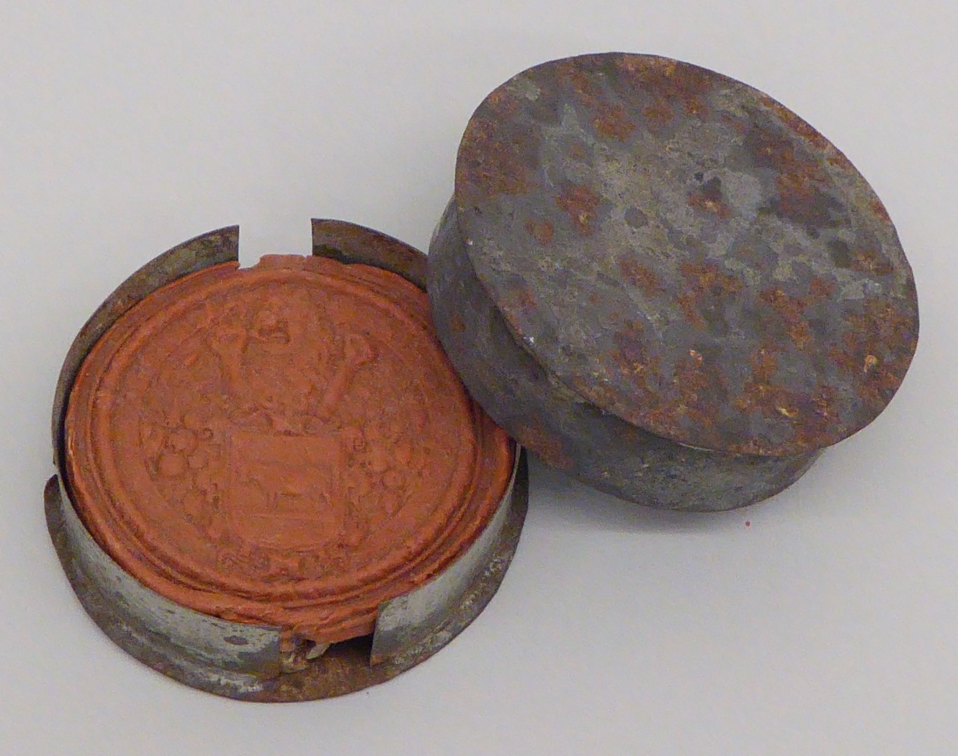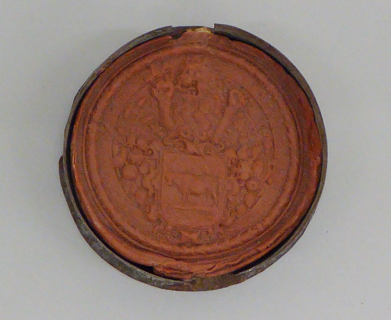 Rood zegel met wapen van Beemster: leeuw houdend een wapen waarop koe, in metalen doosje