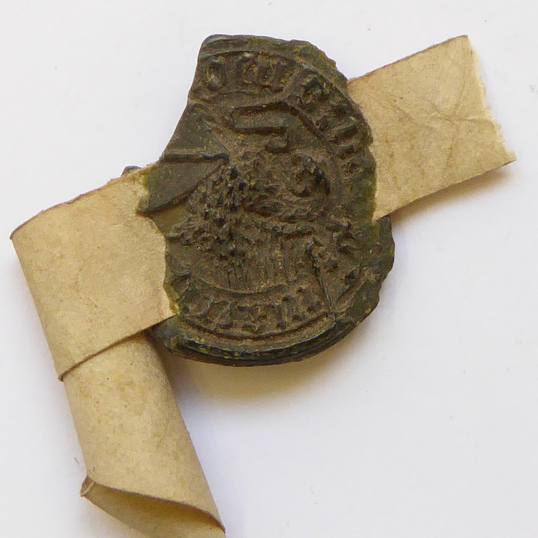 Bruin zegel met adelaar houdend een wapen
