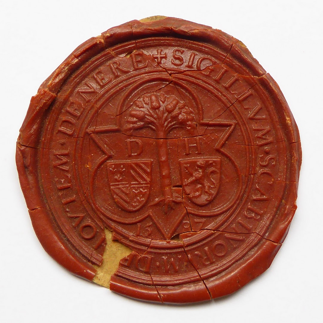 Afdruk van zegelstempel (1587) met boom temidden van wapens in driepas met "... scabinorum de ..."