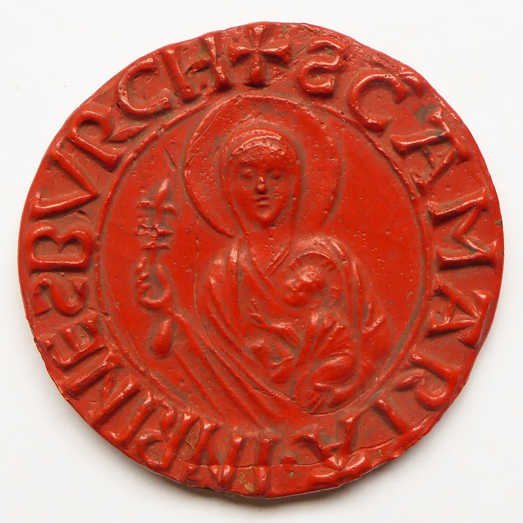 Afdruk van zegelstempel (13de eeuw), borstbeeld Maria met kind met "Sa Maria in Rinesburch"