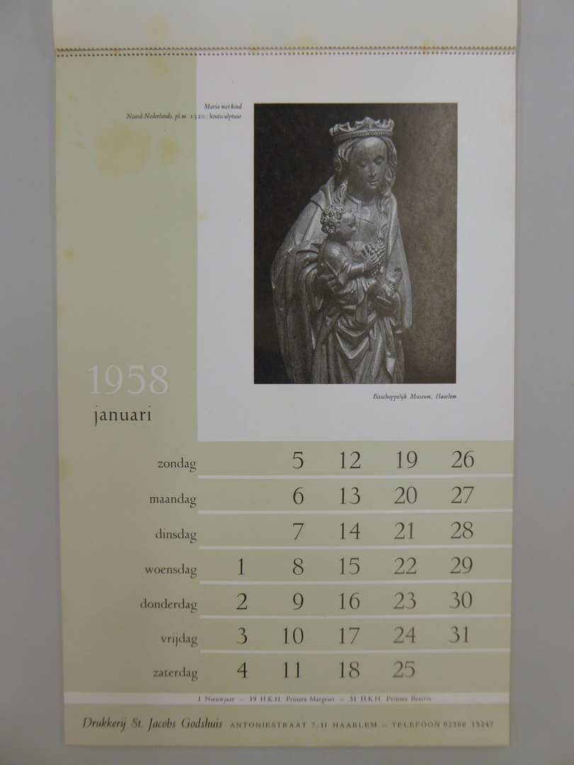 Kalender 1958 met reproducties van kunstwerken uit het Bisschoppelijk Museum te Haarlem