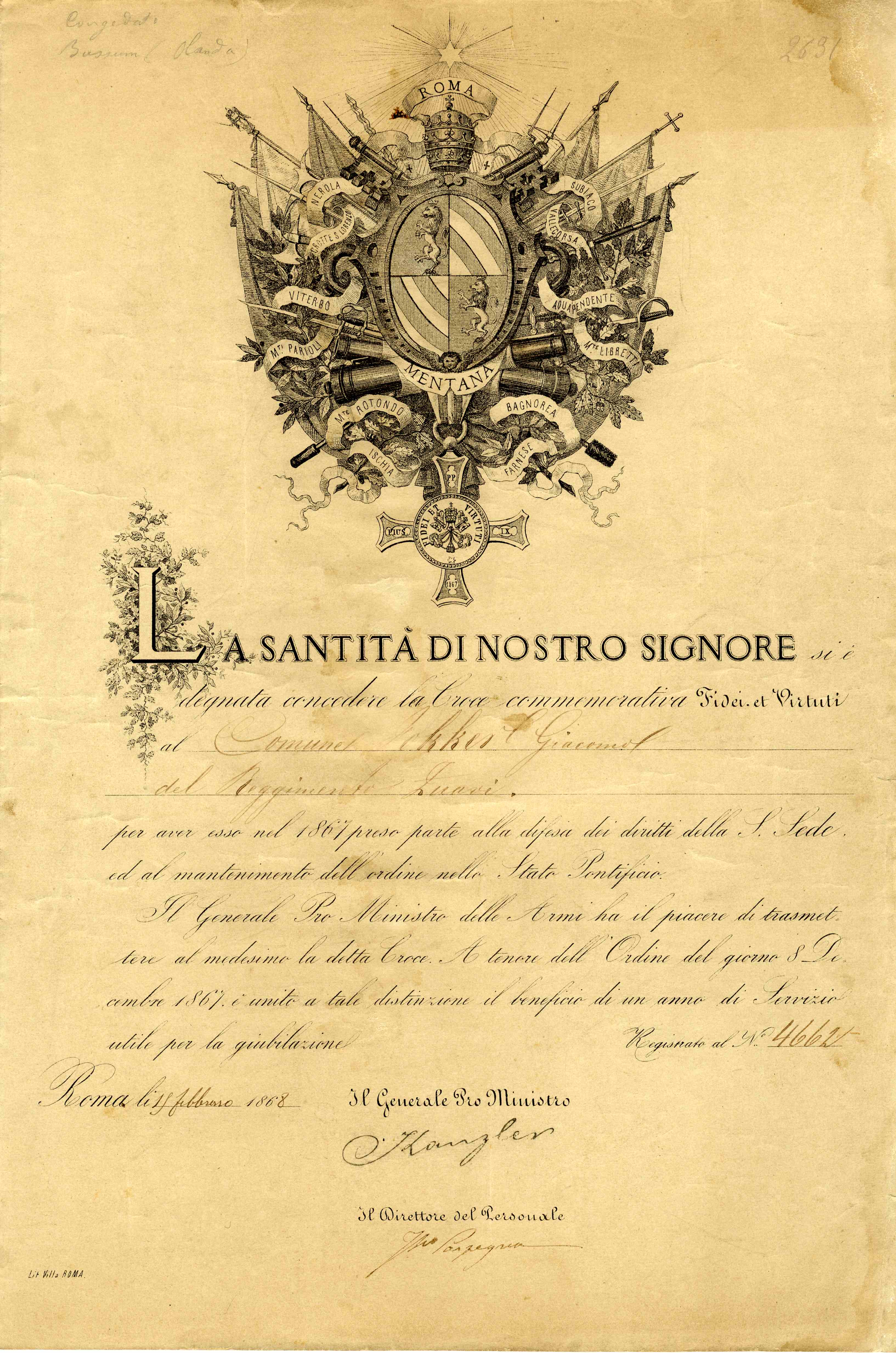 Oorkonde bij Mentanakruis, uitgereikt aan J. Fokker