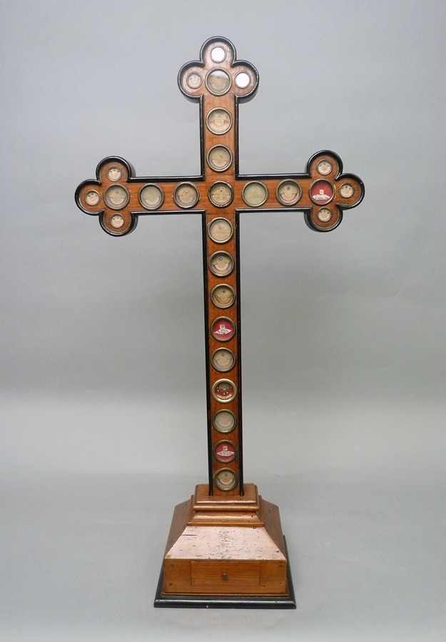 Reliekkruis op losse voet met lade, met 28 reliekmedaillons