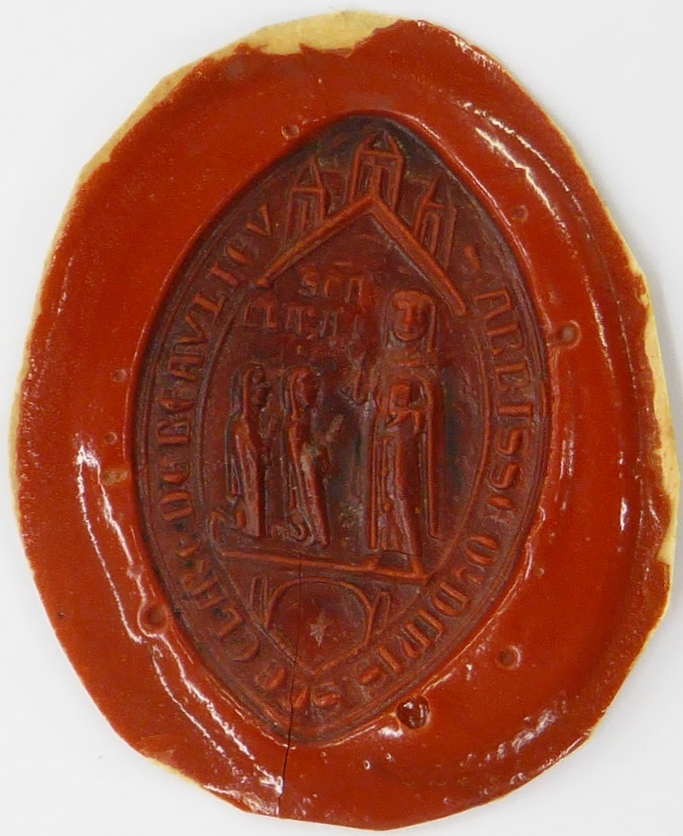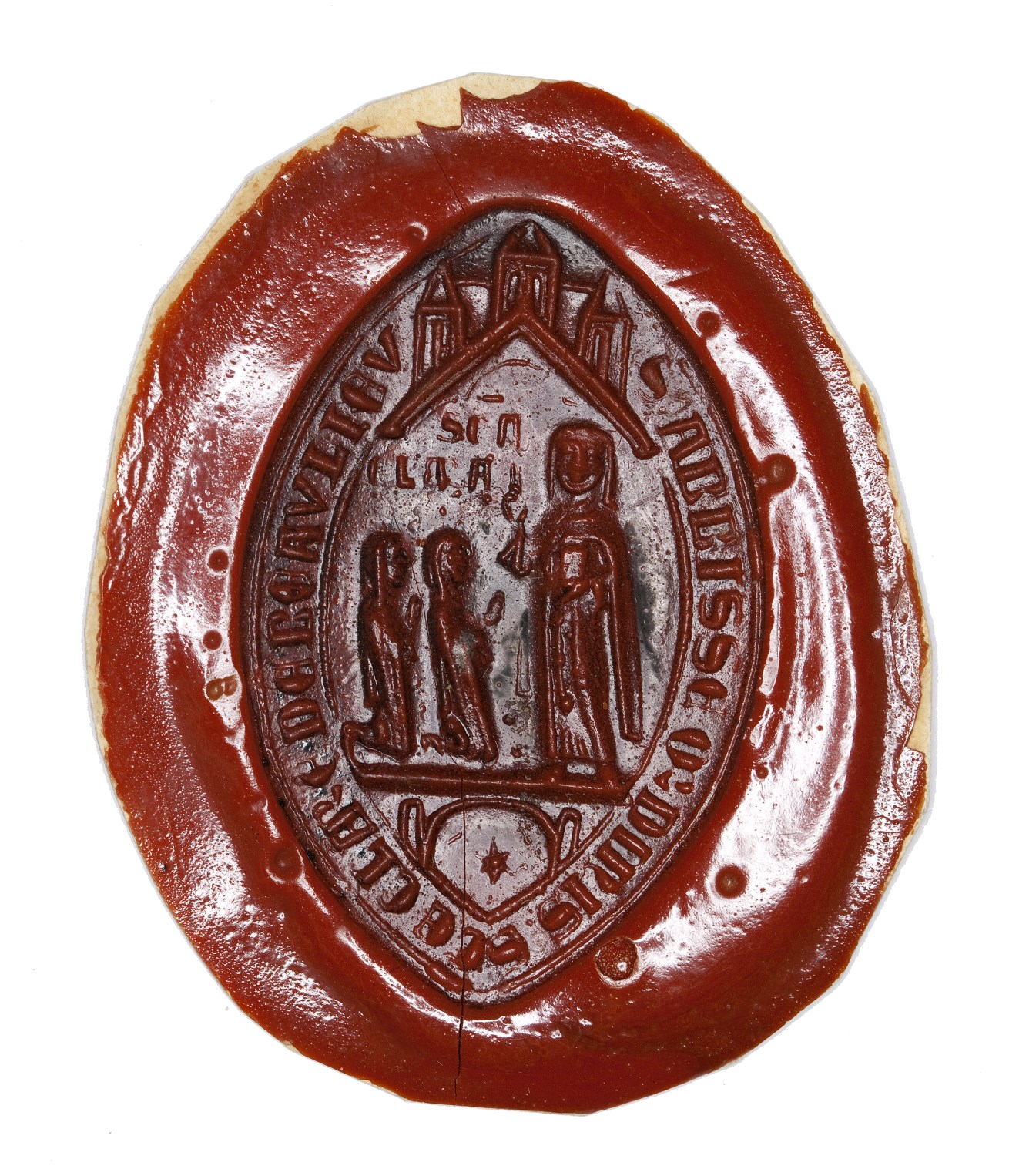 Afdruk van zegelstempel (14de E) van abdis van de clarissen van Beaulieu met H. Clara en twee nonnen
