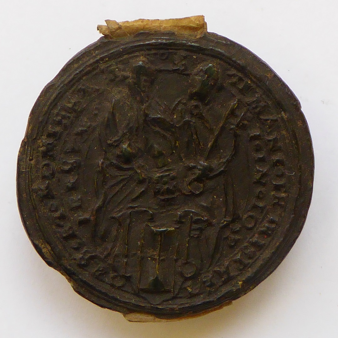 Zegel van een pauselijk bureau met Petrus en Paulus en wapen met zandloper, kz. zandloper