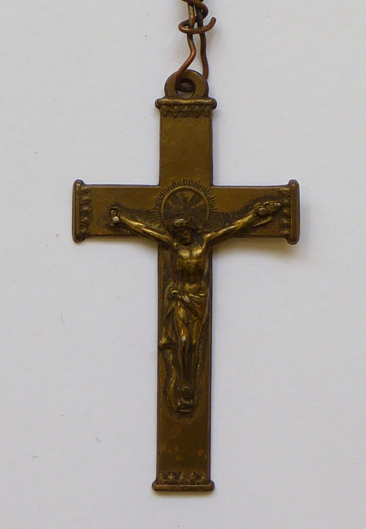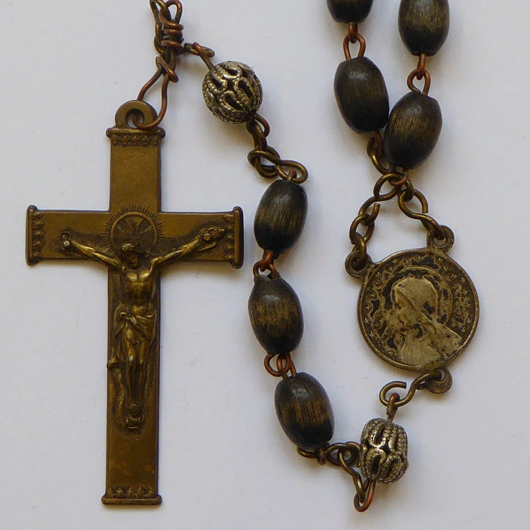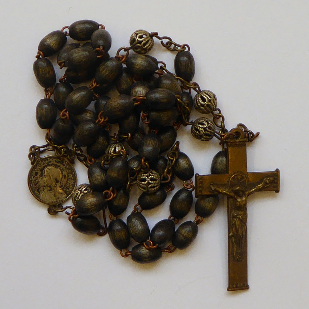 Rozenkrans met kruisje, vijf maal tien plus drie Weesgegroetjes en zes metalen Onze Vaders
