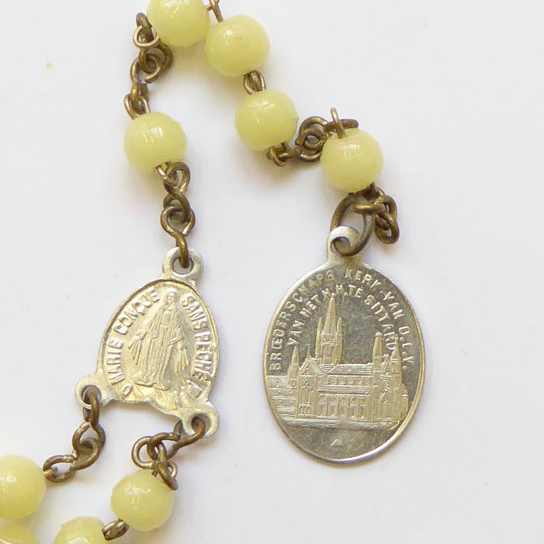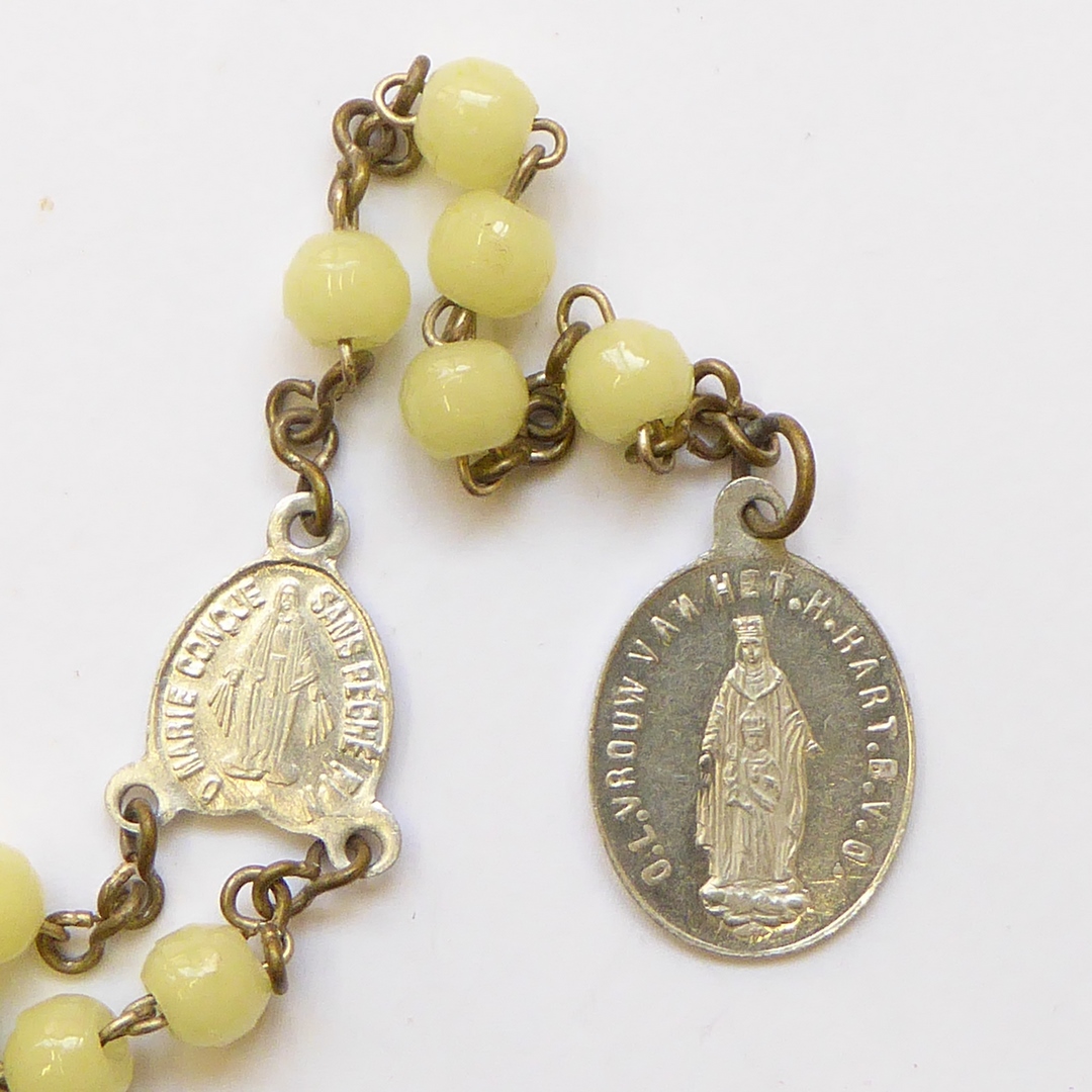 Rozenkrans o.a. met drie maal tien kralen, met penning O.L.V. van het H. Hart, kz. kerk Sittard