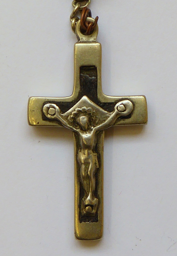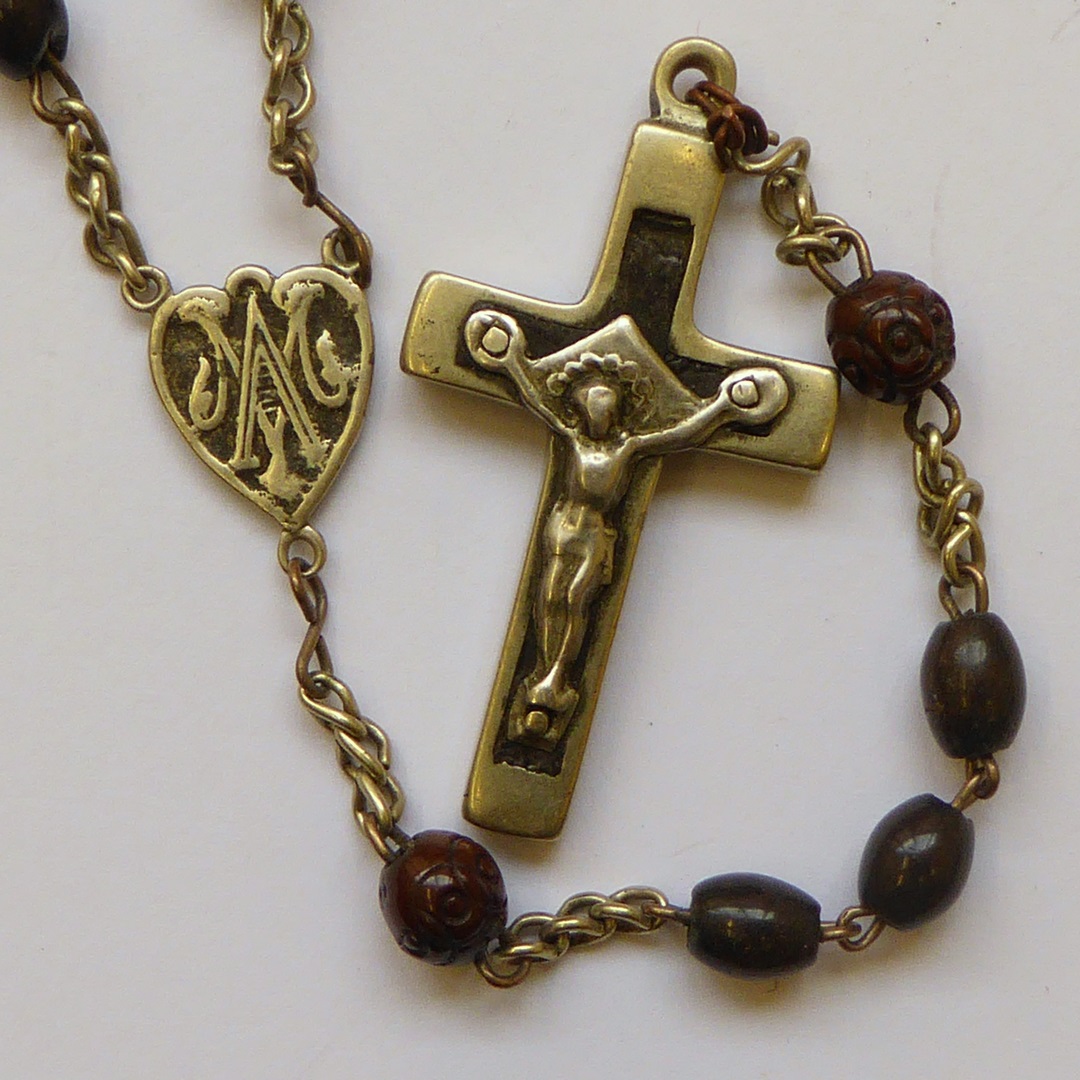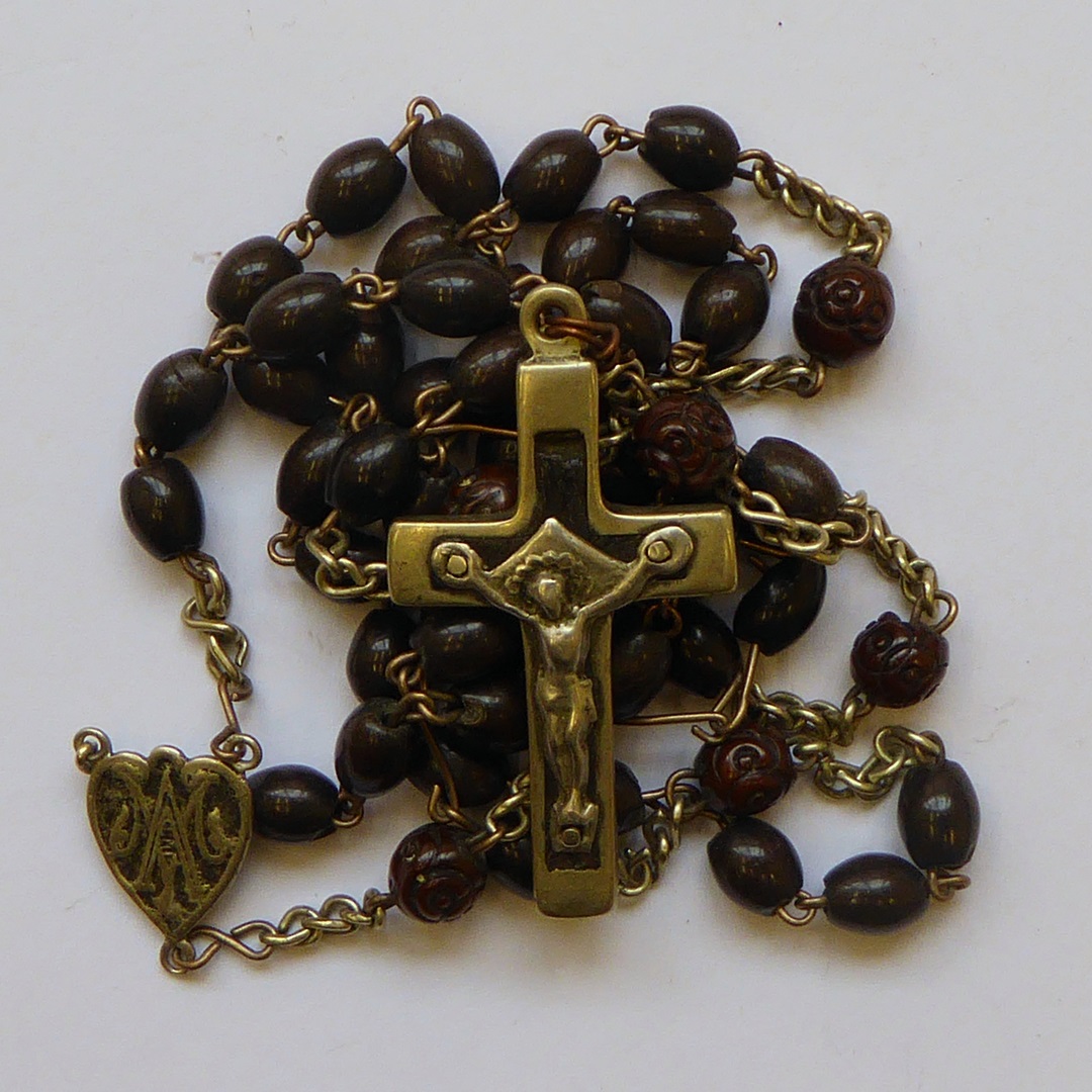 Rozenkrans o.a. met vijf maal tien kralen, met plaatje met Mariamonogram en kruisje