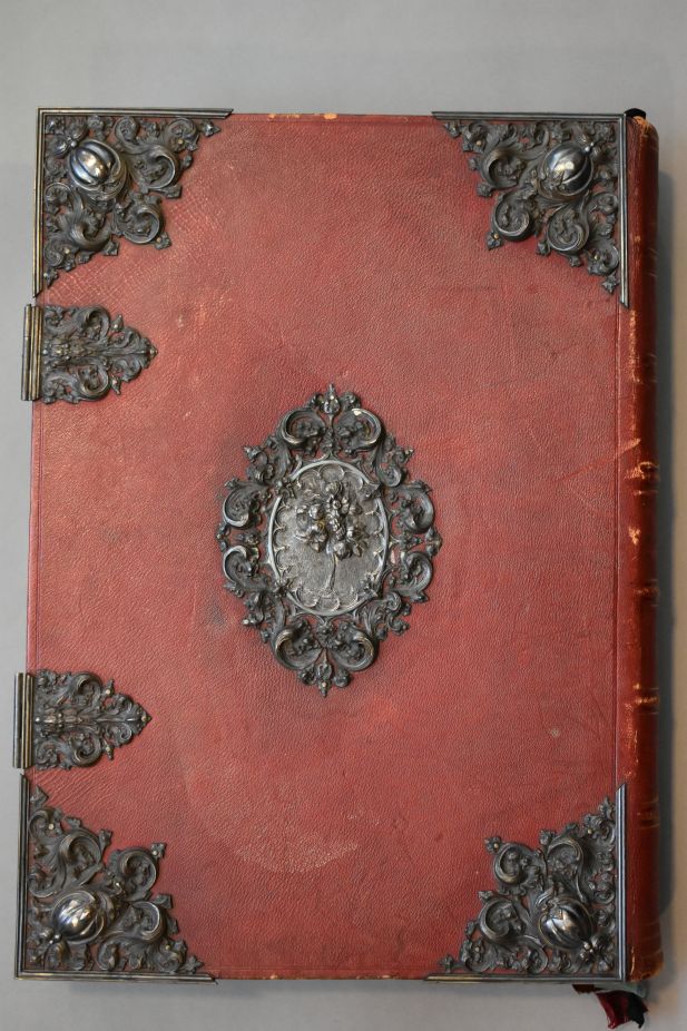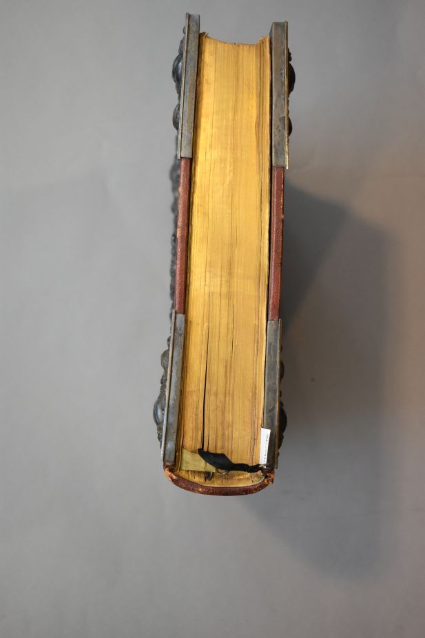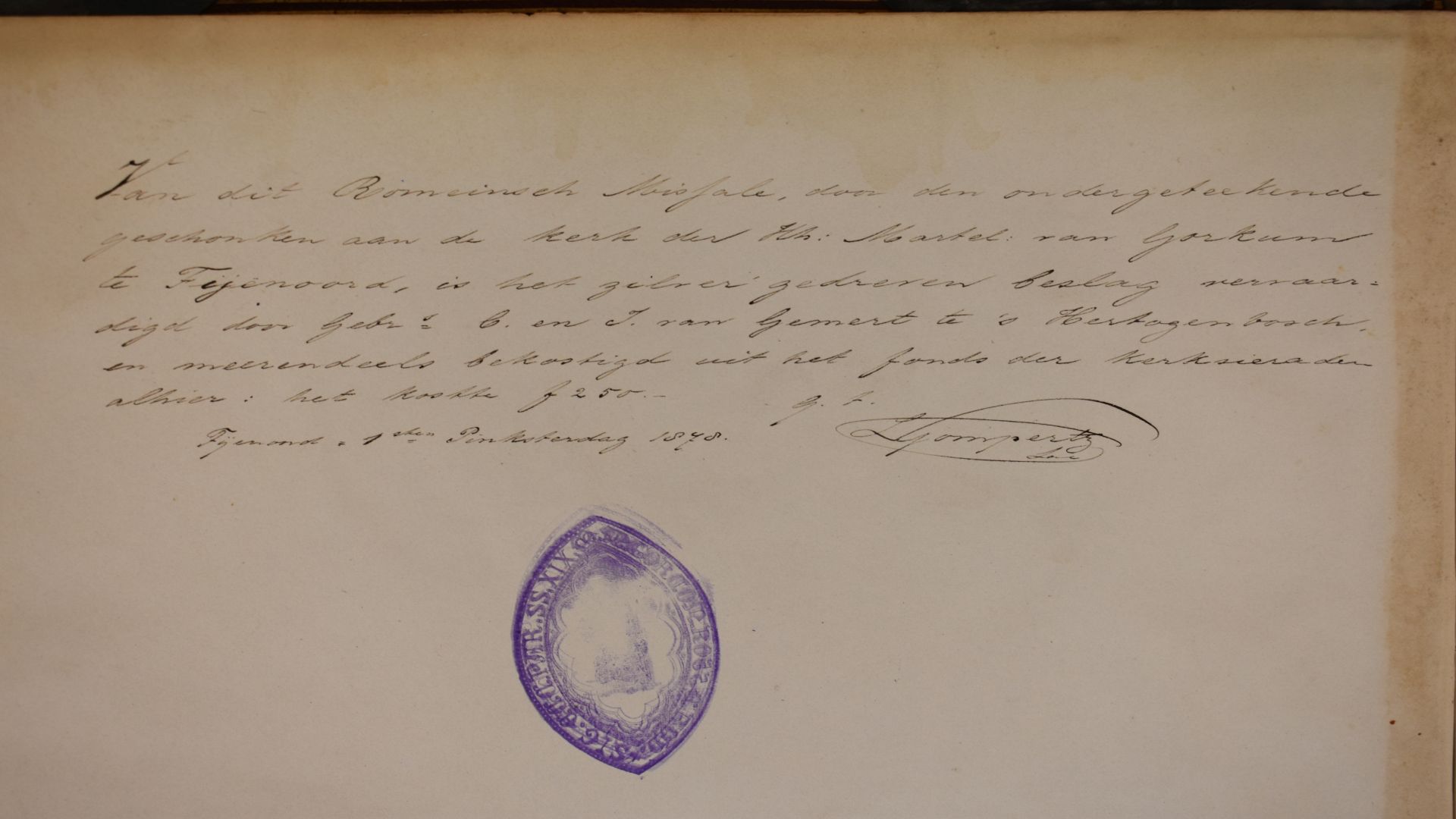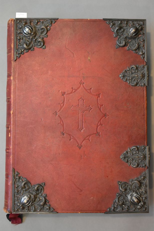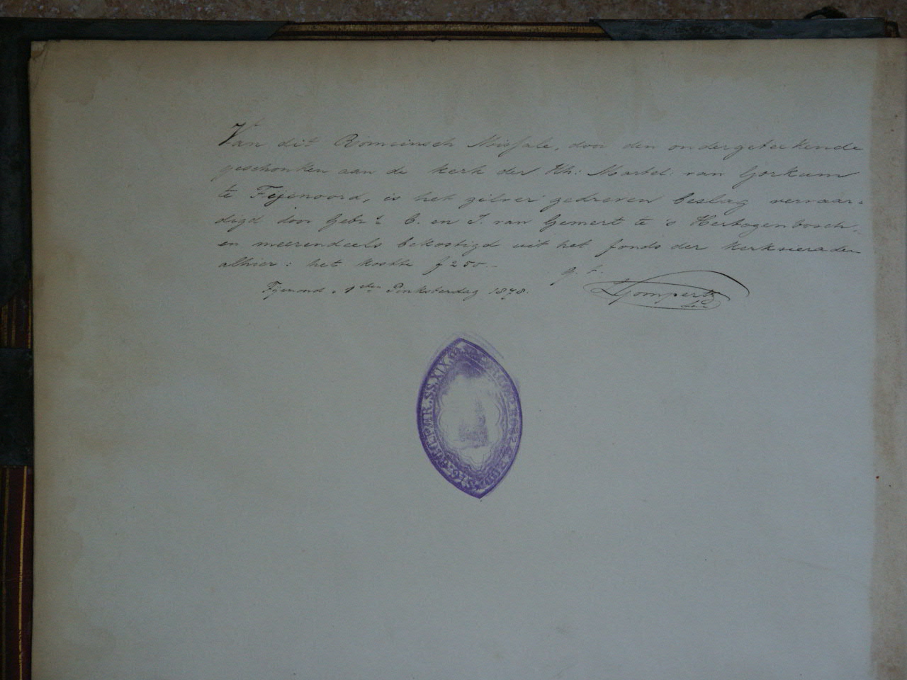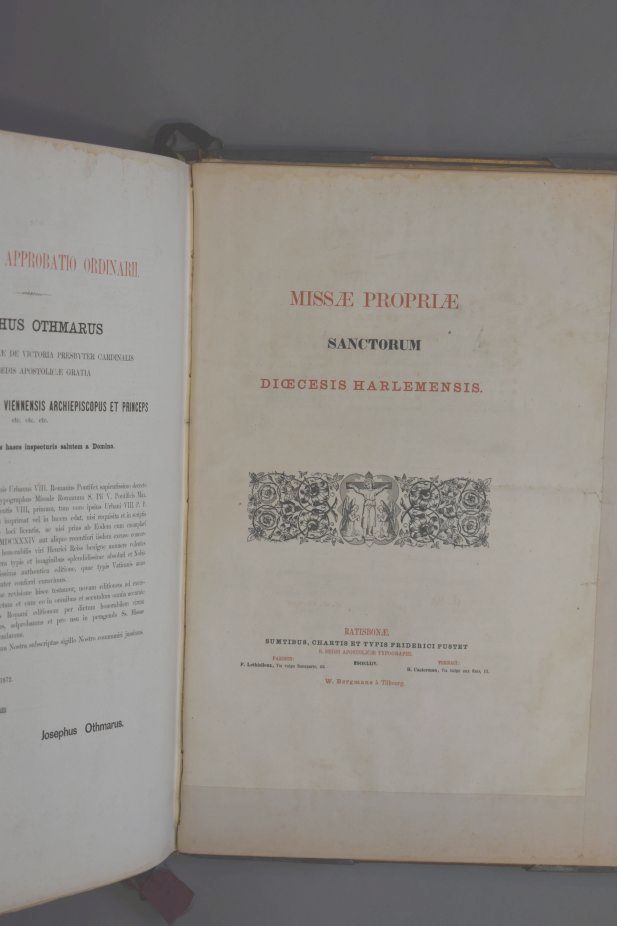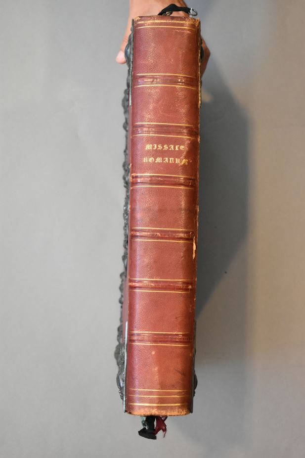 Missale Romanum ex decreto sacrosancti concilii Tridentini restitutum Pii V pontificis Maximi iussu editum, Cementis VIII. et Urbani VIII. Auctoritate recognitum. Geïllustreerd met chromolitho's, neogotisch, geïnspireerd op middeleeuwse miniaturen. Op het voorste schutblad is met pen geschreven: "Van dit Romeinsch Missale, door den ondergeteekende geschonken aan de kerk der Hh. Martel. van Gorkum te Feijenoord, ...