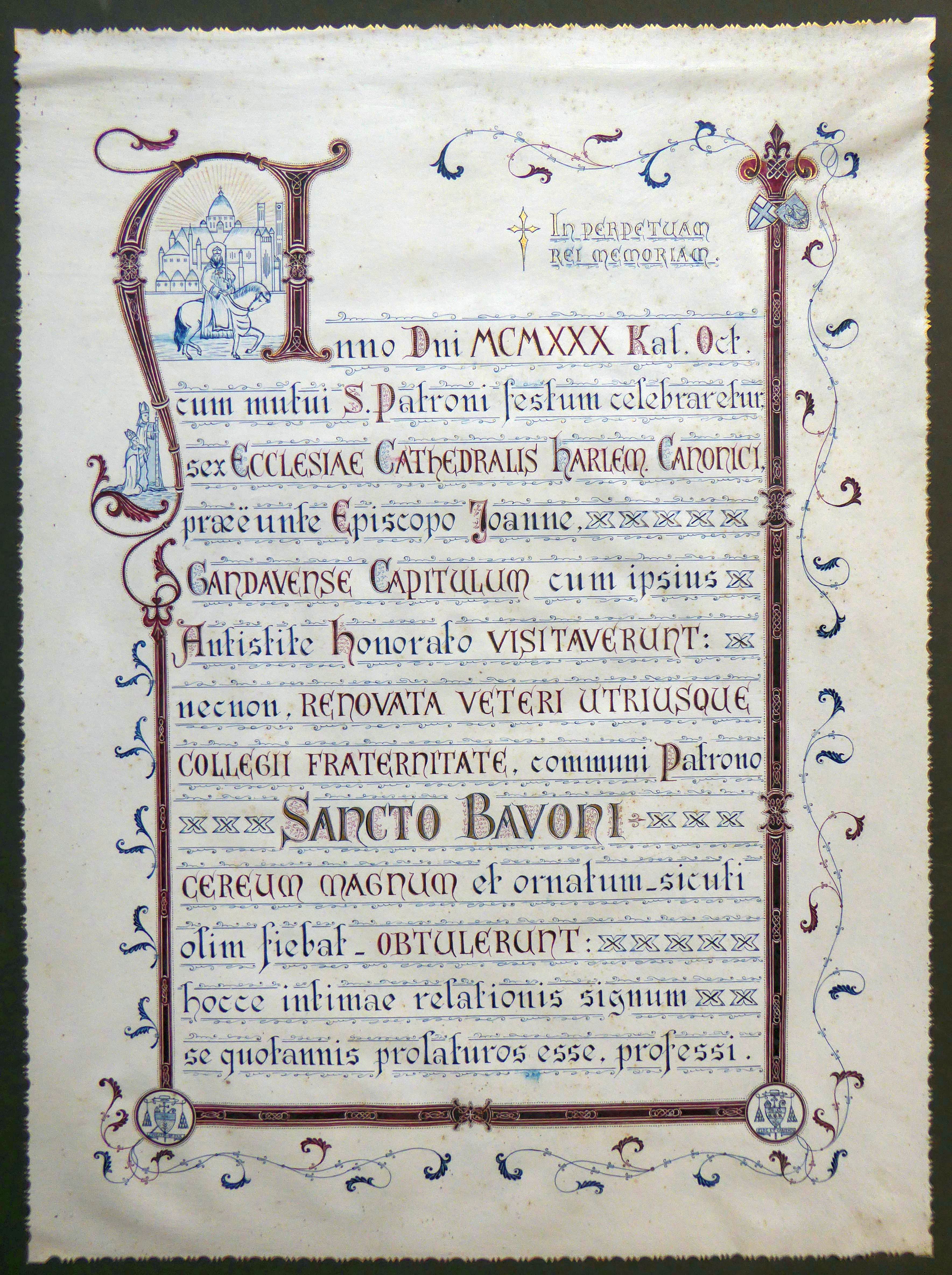 Oorkonde bij hernieuwde gezamenlijke viering van patroonsfeest Sint-Bavo door Haarlem en Gent met "Anno Dni MCMXXX Kal. Oct. cum mutui S. Patroni festum celebraretur, ..."