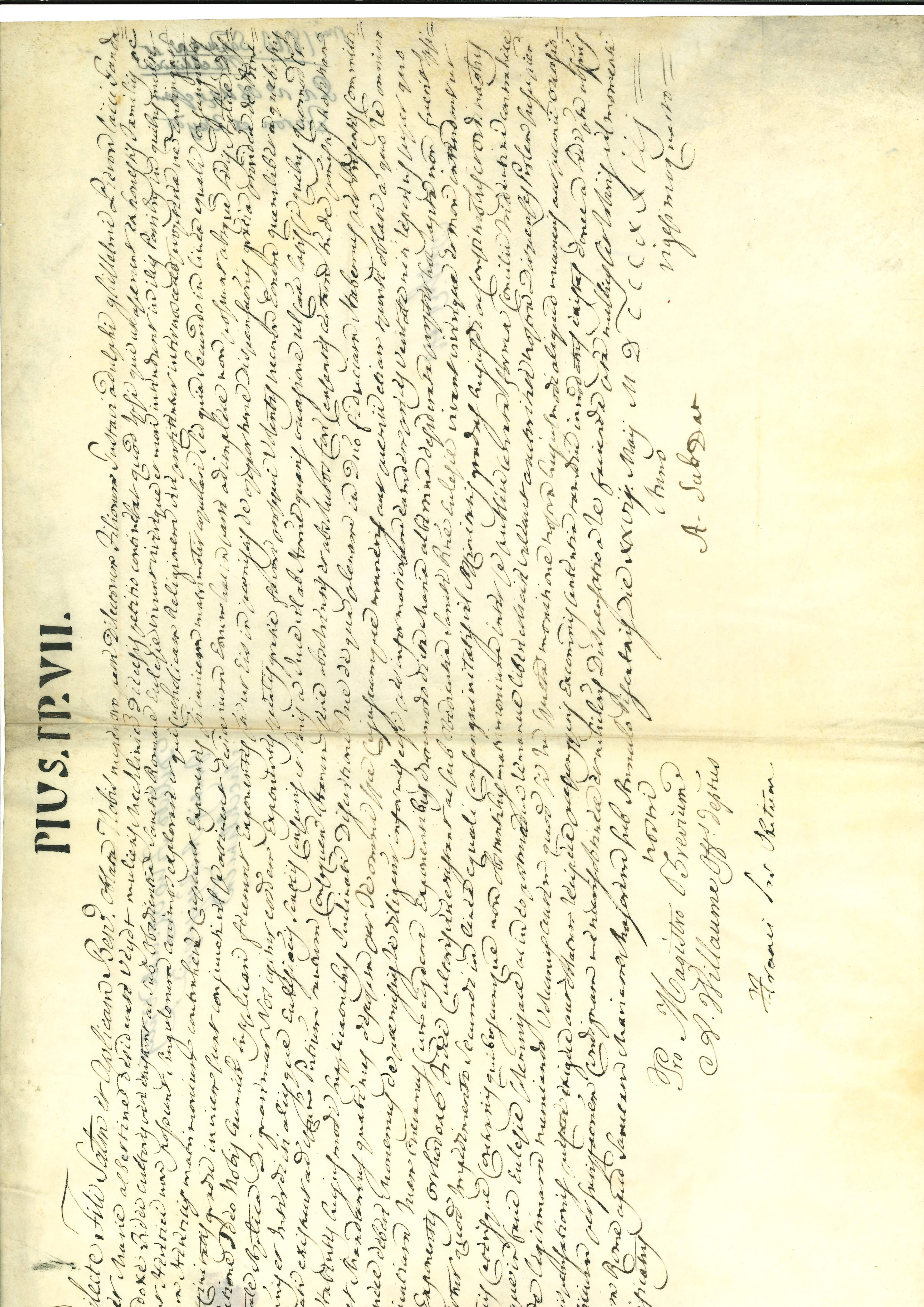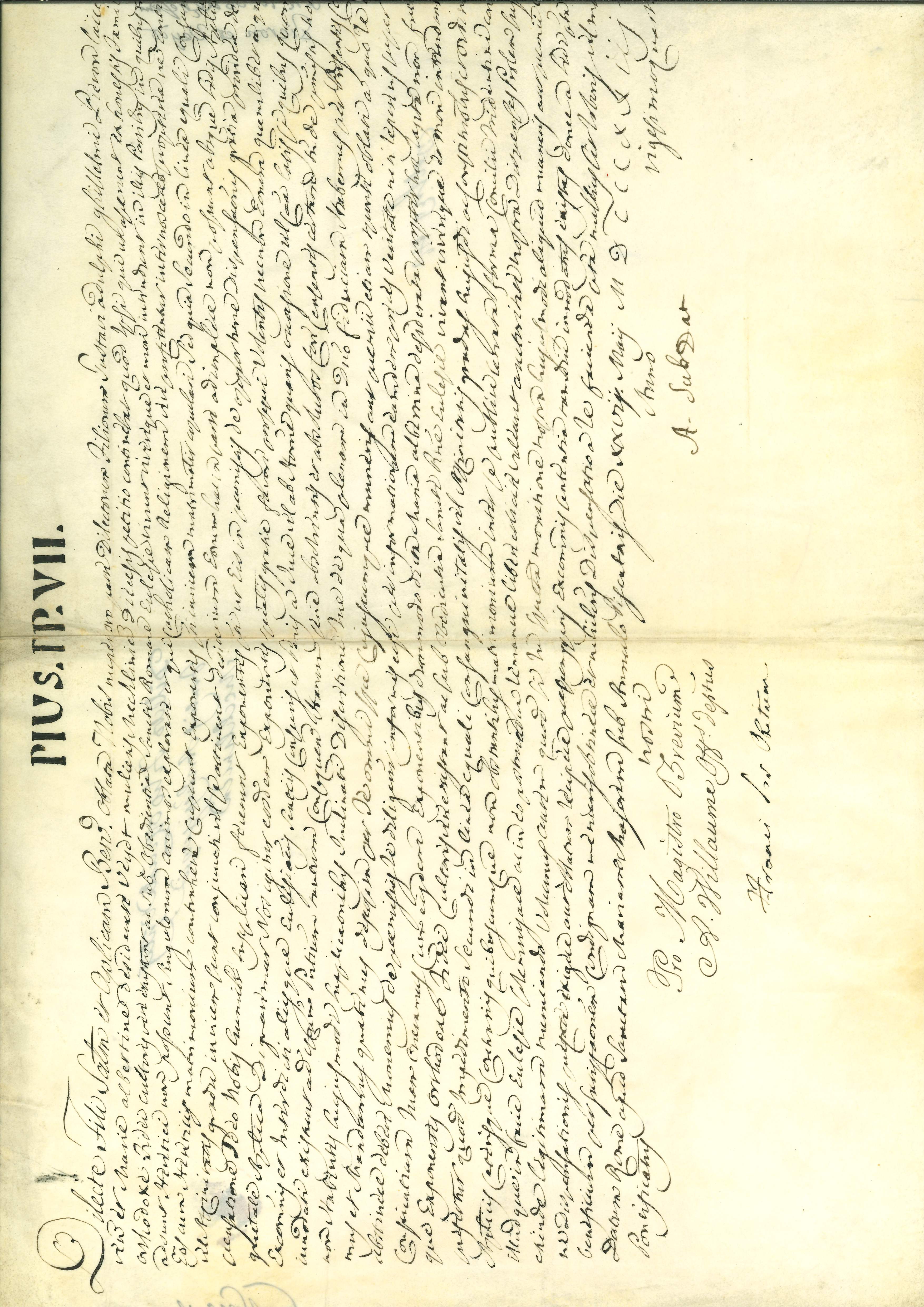 Breve Pius VIII dd. 27 mei 1823, zonder zegel: Toestemming tot huwelijk van Gustave Guillaume Pieron, te Gent, met Marie Albertine Désirée Veydt uit diocees Mechelen