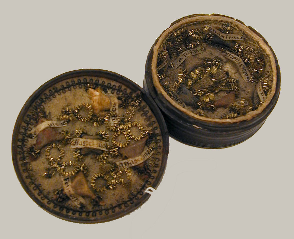 Doos in ronde vorm waarin relieken met centraal een Mariabeeldje van pijpaarde