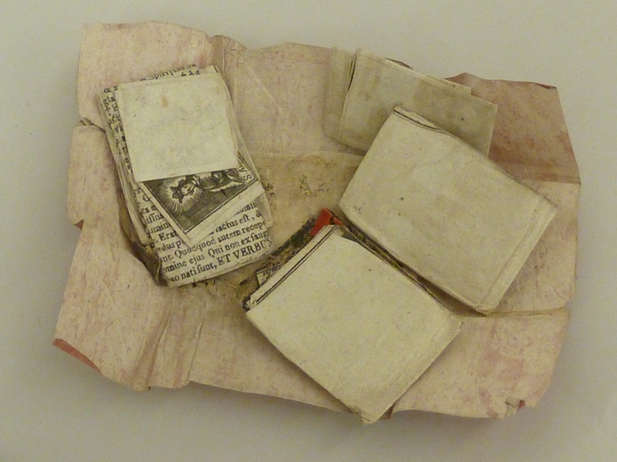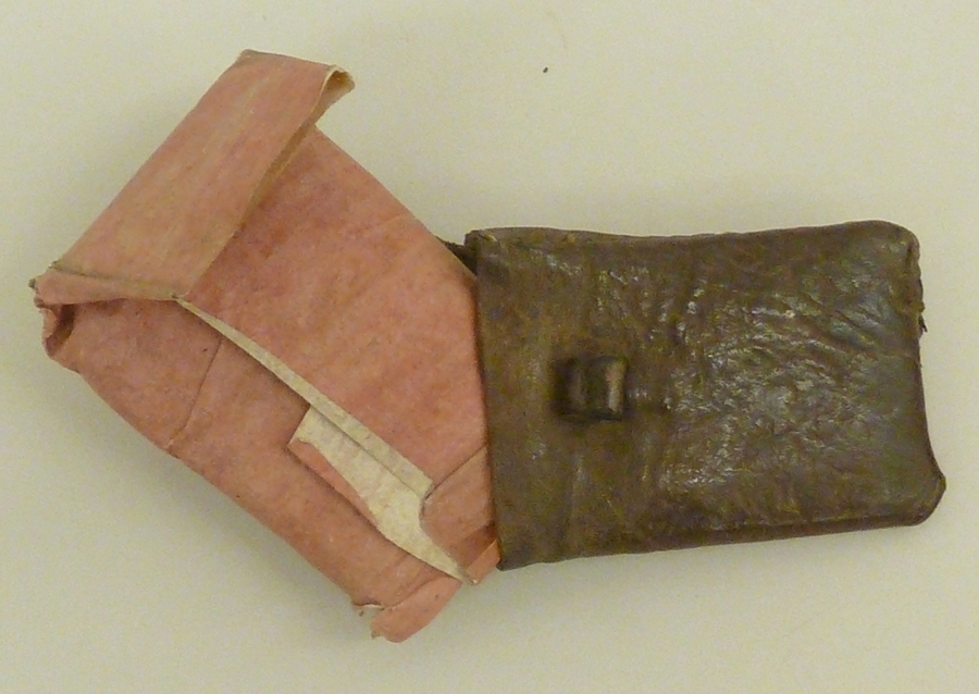 Leren beursje met omslag waarin plaatjes van het Caravacakruis en heiligen