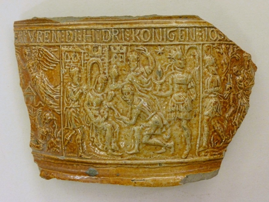 Scherf kruik met voorstelling aanbidding der koningen, en deels kerstnacht en vlucht naar Egypte