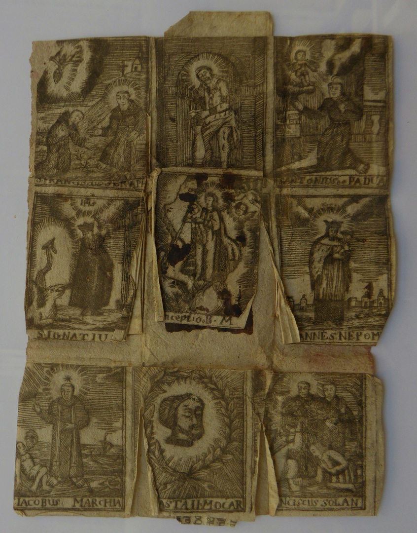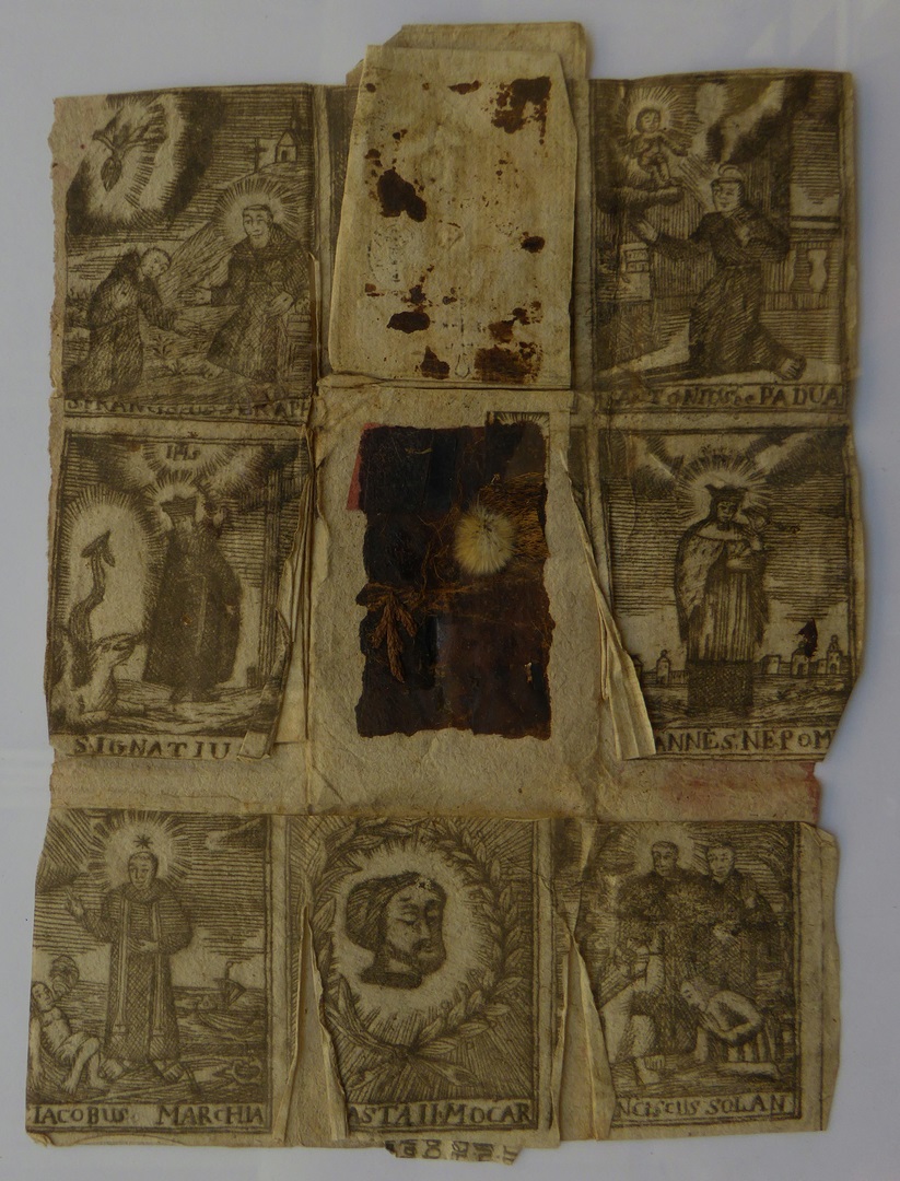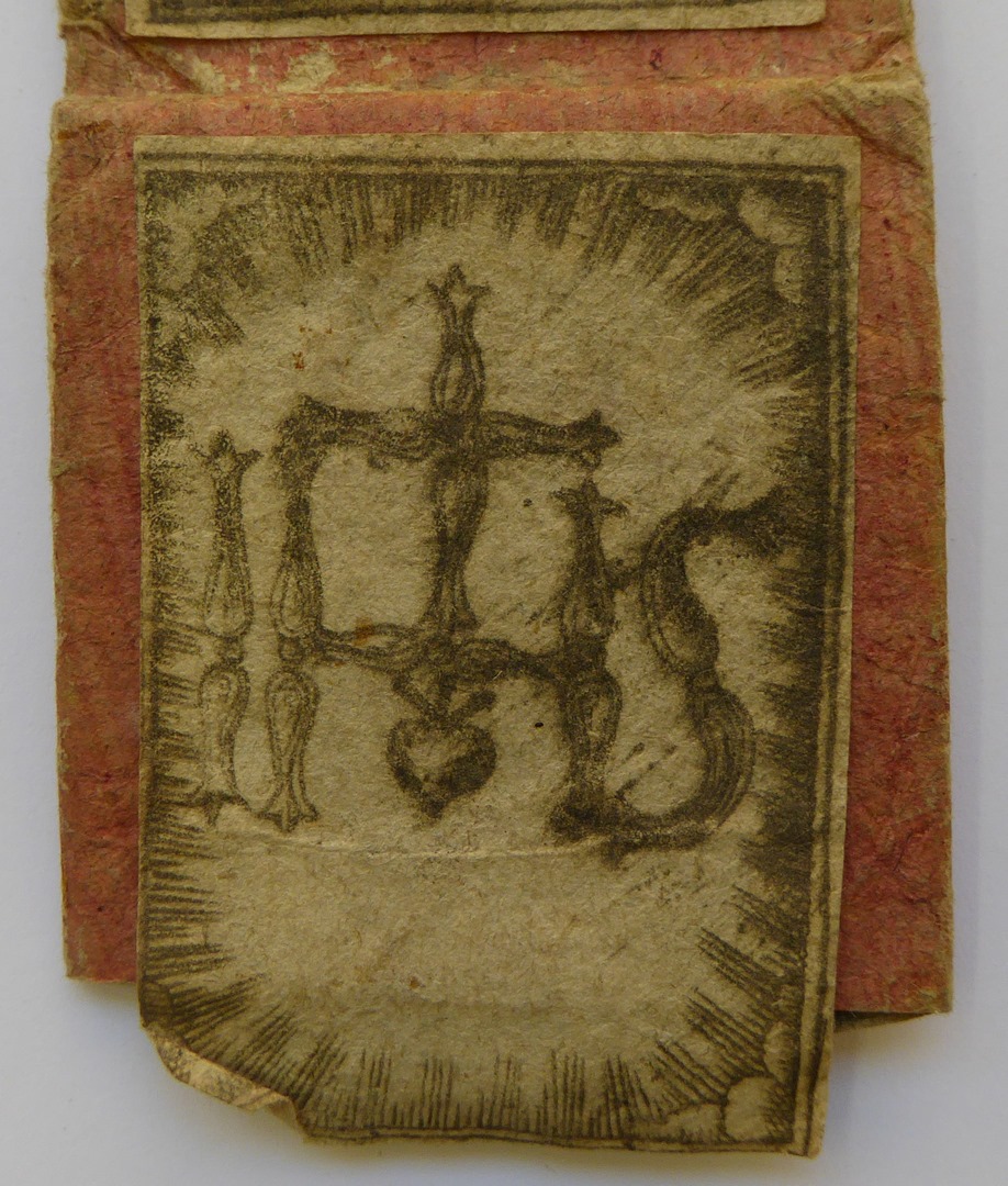 Rode omslag met Maria en IHS, met binnenin o.a. H. Antonius van Padua, Ignatius, middenin relieken