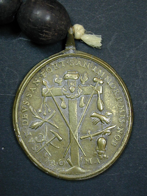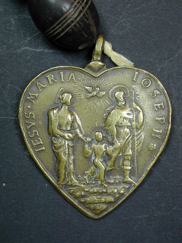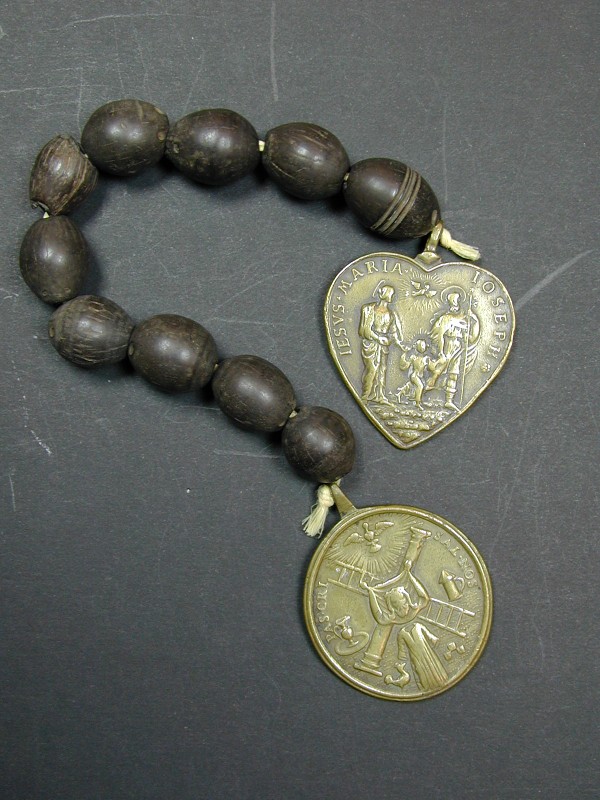 Rozenkranstientje met ebbenhouten kralen, met twee medailles: lijdenswerktuigen en H. Familie