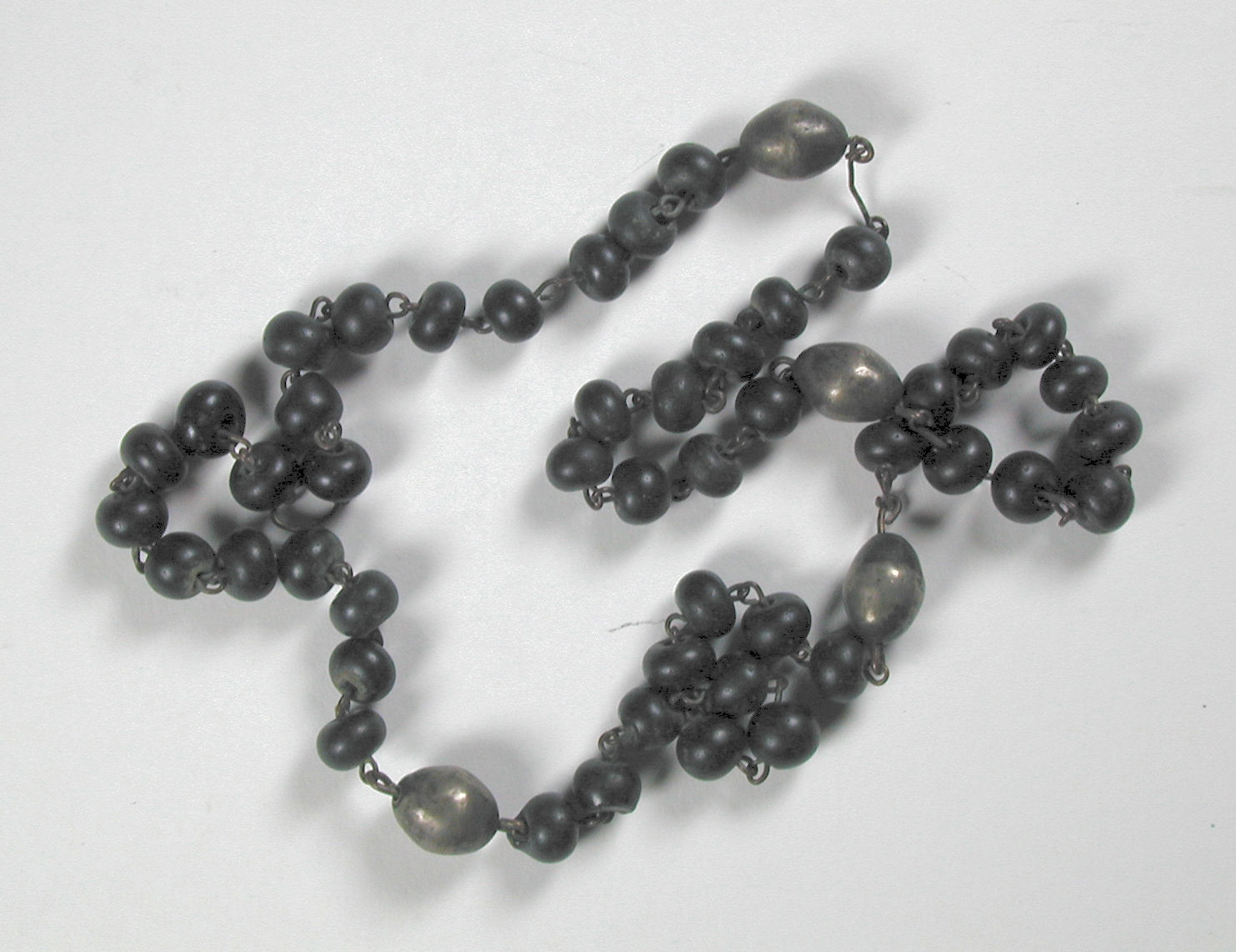 Rozenkrans met zwarte benen(?) kralen en vier zilveren 'onze vaders'