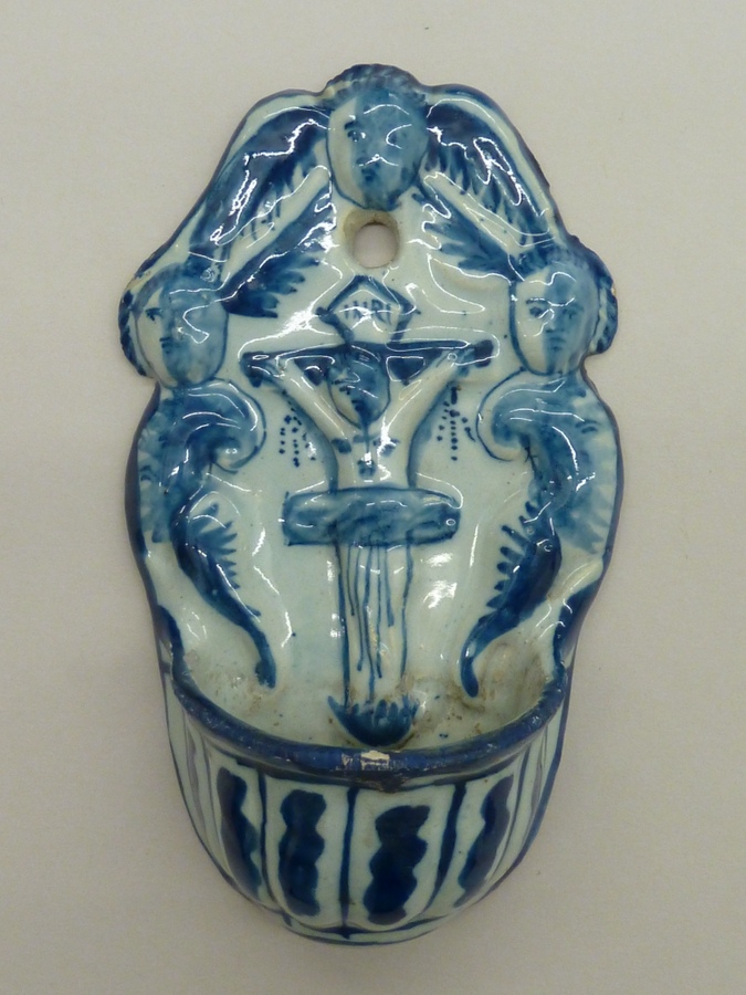 Wijwaterbakje versierd met crucifix geflankeerd door drie engeltjes