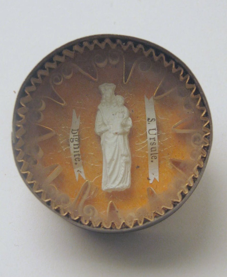 Reliekhouder met beeldje van Maria met kind en relieken van HH. Ursula en Dignité