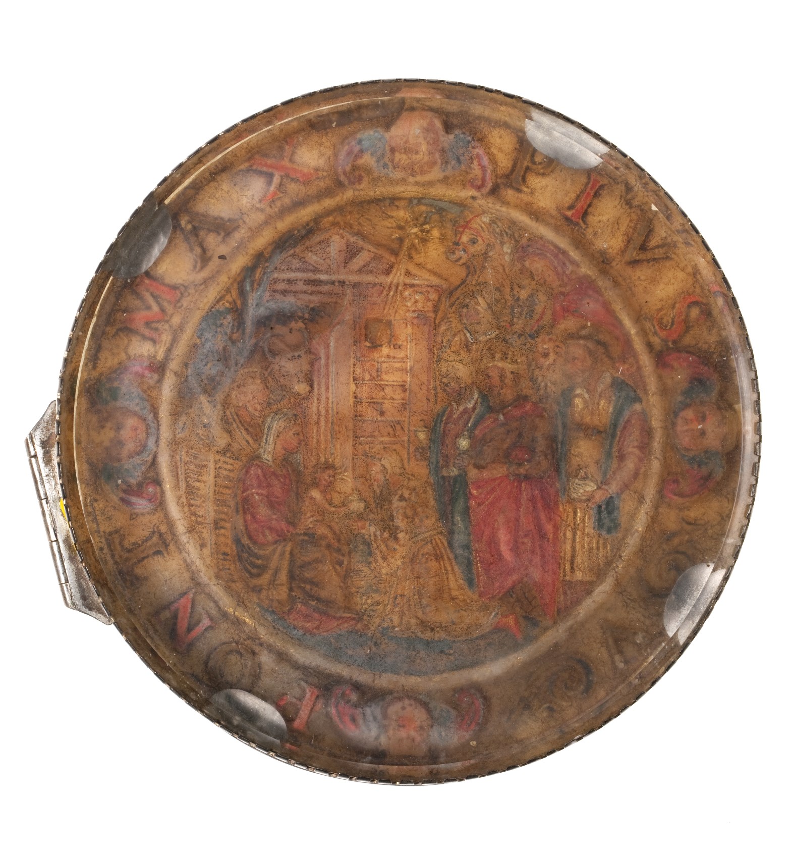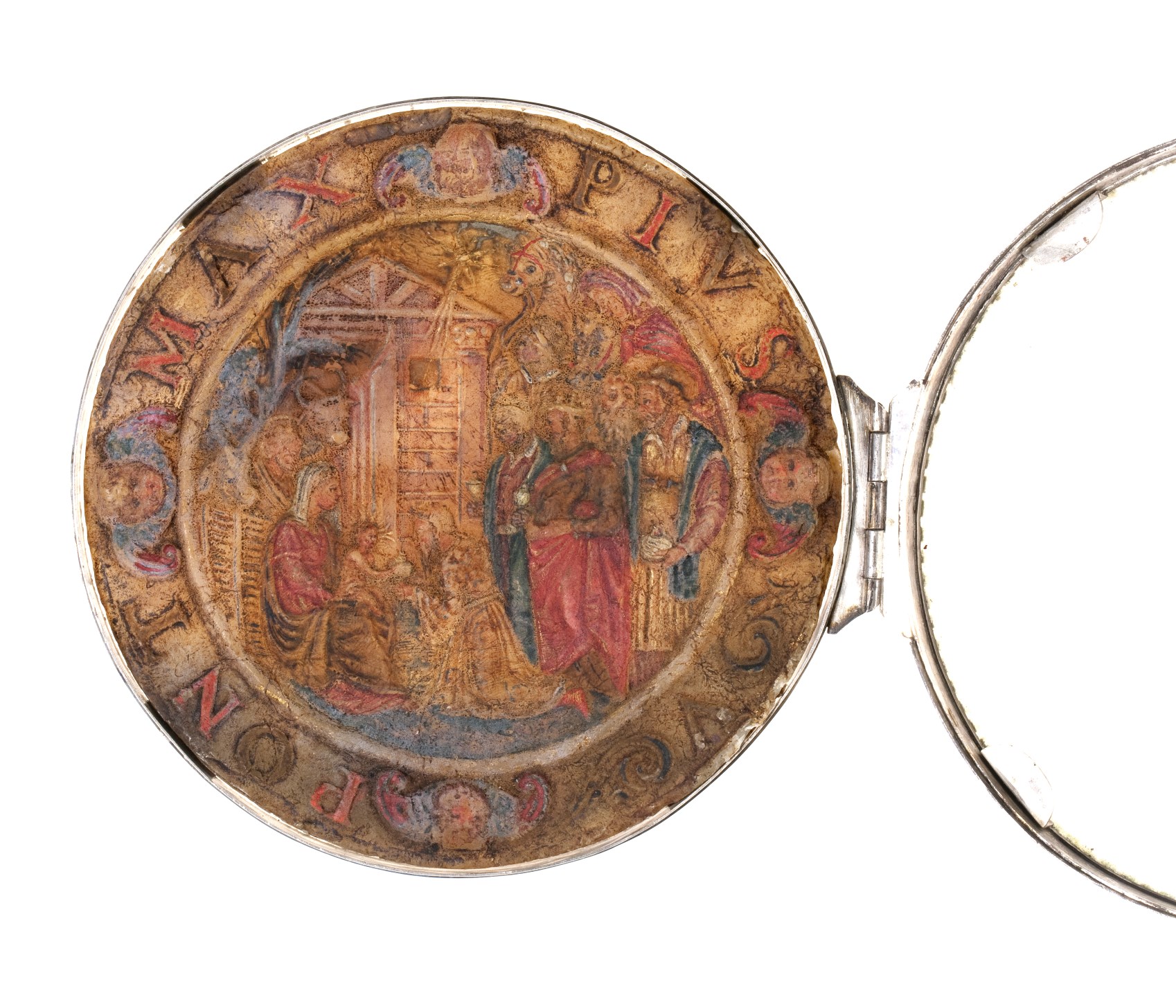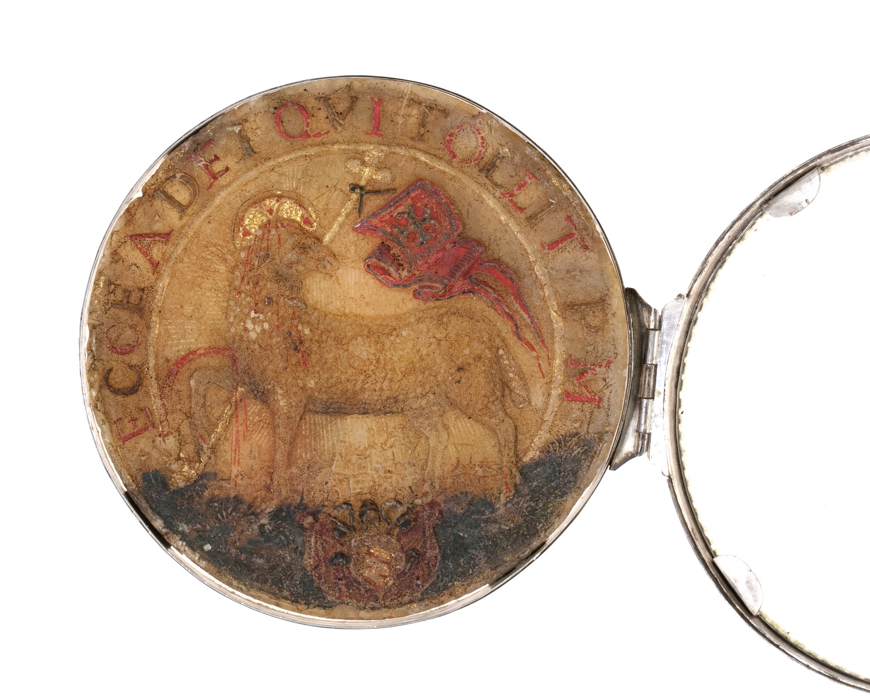 Agnus Dei met aanbidding der koningen en wapen Pius V met goudverf, in zilveren houder