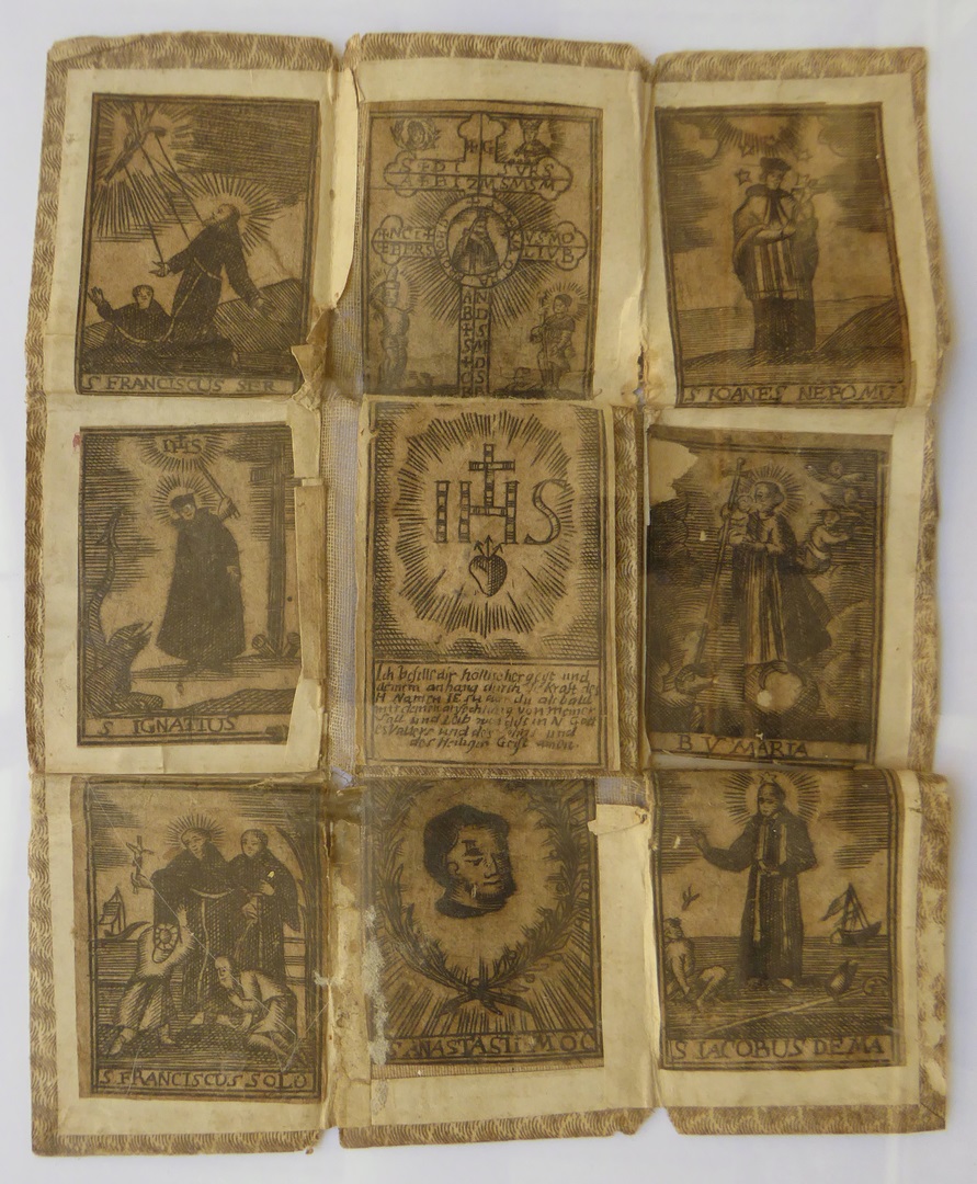 Zeven heiligen, caravacakruis, middenin IHS waaronder heiligdommetje met beeldje en hangertje